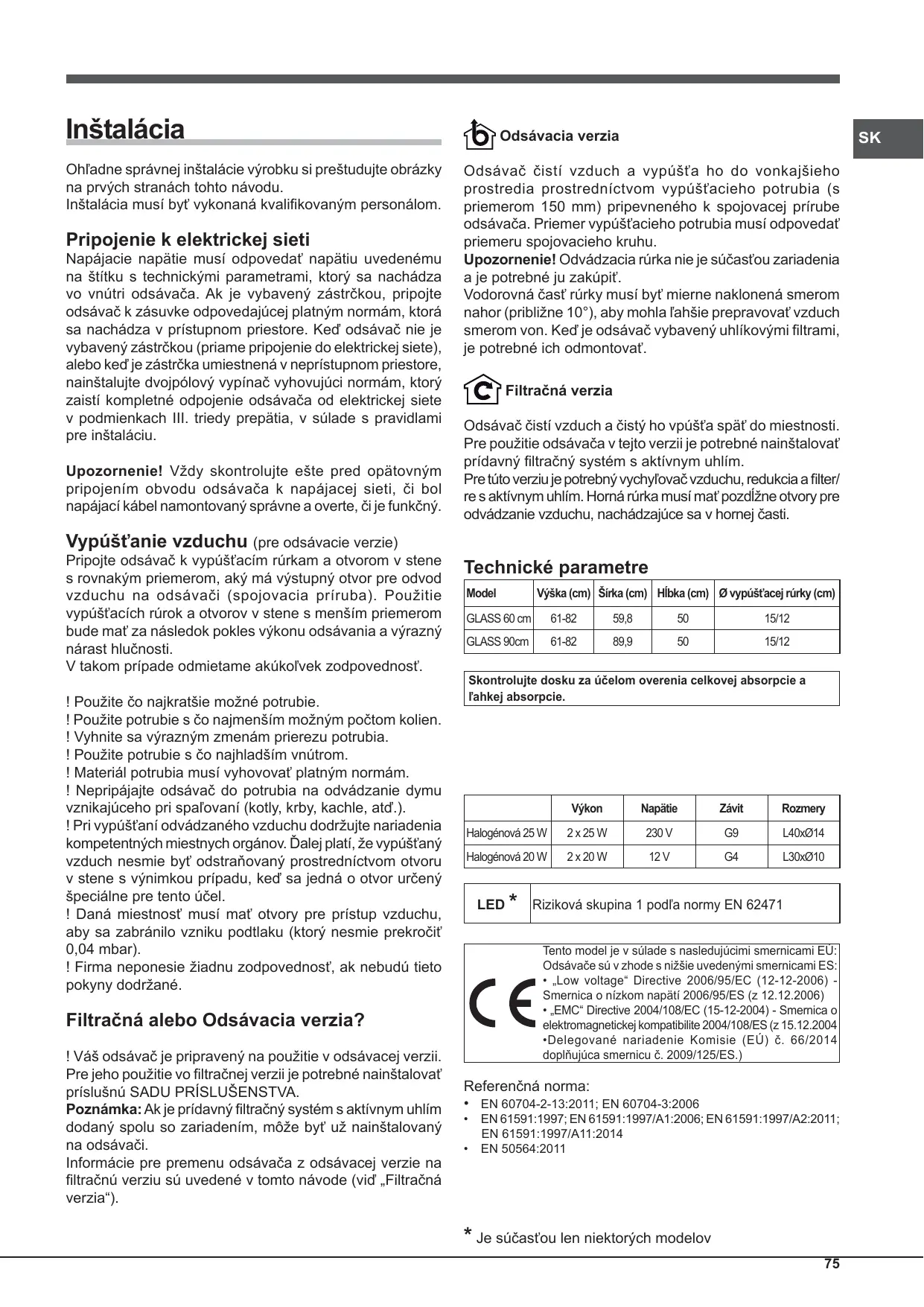 Odsávač čistí vzduch a vypúšťa ho do vonkajšieho prostredia prostredníctvom vypúšťacieho potrubia (s priemerom 150 mm) pripevneného k spojovacej prírube odsávača. Priemer vypúšťacieho potrubia musí odpovedať priemeru spojovacieho kruhu. Upozornenie! Odvádzacia rúrka nie je súčasťou zariadenia a je potrebné ju zakúpiť. Vodorovná časť rúrky musí byť mierne naklonená smerom nahor (približne 10°), aby mohla ľahšie prepravovať vzduch smerom von. Keď je odsávač vybavený uhlíkovými filtrami, je potrebné ich odmontovať. Filtračná verzia Odsávač čistí vzduch a čistý ho vpúšťa späť do miestnosti. Pre použitie odsávača v tejto verzii je potrebné nainštalovať prídavný filtračný systém s aktívnym uhlím. Pre túto verziu je potrebný vychyľovač vzduchu, redukcia a filter/ re s aktívnym uhlím. Horná rúrka musí mať pozdĺžne otvory pre odvádzanie vzduchu, nachádzajúce sa v hornej časti. Vypúšťanie vzduchu (pre odsávacie verzie) Pripojte odsávač k vypúšťacím rúrkam a otvorom v stene s rovnakým priemerom, aký má výstupný otvor pre odvod vzduchu na odsávači (spojovacia príruba). Použitie vypúšťacích rúrok a otvorov v stene s menším priemerom bude mať za následok pokles výkonu odsávania a výrazný nárast hlučnosti. V takom prípade odmietame akúkoľvek zodpovednosť. ! Použite čo najkratšie možné potrubie. ! Použite potrubie s čo najmenším možným počtom kolien. ! Vyhnite sa výrazným zmenám prierezu potrubia. ! Použite potrubie s čo najhladším vnútrom. ! Materiál potrubia musí vyhovovať platným normám. ! Nepripájajte odsávač do potrubia na odvádzanie dymu vznikajúceho pri spaľovaní (kotly, krby, kachle, atď.). ! Pri vypúšťaní odvádzaného vzduchu dodržujte nariadenia kompetentných miestnych orgánov. Ďalej platí, že vypúšťaný vzduch nesmie byť odstraňovaný prostredníctvom otvoru v stene s výnimkou prípadu, keď sa jedná o otvor určený špeciálne pre tento účel. ! Daná miestnosť musí mať otvory pre prístup vzduchu, aby sa zabránilo vzniku podtlaku (ktorý nesmie prekročiť 0,04 mbar). ! Firma neponesie žiadnu zodpovednosť, ak nebudú tieto pokyny dodržané. Technické parametre Model GLASS 60 cm 61-82 59,8