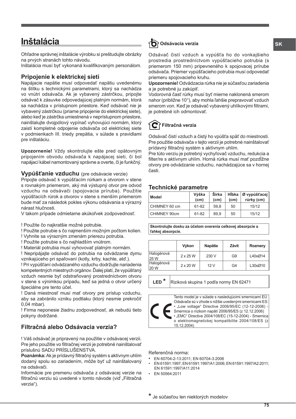 Inštalácia Ohľadne správnej inštalácie výrobku si preštudujte obrázky na prvých stranách tohto návodu. Inštalácia musí byť vykonaná kvalifikovaným personálom. Pripojenie k elektrickej sieti Napájacie napätie musí odpovedať napätiu uvedenému na štítku s technickými parametrami, ktorý sa nachádza vo vnútri odsávača. Ak je vybavený zástrčkou, pripojte odsávač k zásuvke odpovedajúcej platným normám, ktorá sa nachádza v prístupnom priestore. Keď odsávač nie je vybavený zástrčkou (priame pripojenie do elektrickej siete), alebo keď je zástrčka umiestnená v neprístupnom priestore, nainštalujte dvojpólový vypínač vyhovujúci normám, ktorý zaistí kompletné odpojenie odsávača od elektrickej siete v podmienkach III. triedy prepätia, v súlade s pravidlami pre inštaláciu. Upozornenie! Vždy skontrolujte ešte pred opätovným pripojením obvodu odsávača k napájacej sieti, či bol napájací kábel namontovaný správne a overte, či je funkčný. Vypúšťanie vzduchu (pre odsávacie verzie) Pripojte odsávač k vypúšťacím rúrkam a otvorom v stene s rovnakým priemerom, aký má výstupný otvor pre odvod vzduchu na odsávači (spojovacia príruba). Použitie vypúšťacích rúrok a otvorov v stene s menším priemerom bude mať za následok pokles výkonu odsávania a výrazný nárast hlučnosti. V takom prípade odmietame akúkoľvek zodpovednosť. ! Použite čo najkratšie možné potrubie. ! Použite potrubie s čo najmenším možným počtom kolien. ! Vyhnite sa výrazným zmenám prierezu potrubia. ! Použite potrubie s čo najhladším vnútrom. ! Materiál potrubia musí vyhovovať platným normám. ! Nepripájajte odsávač do potrubia na odvádzanie dymu vznikajúceho pri spaľovaní (kotly, krby, kachle, atď.). ! Pri vypúšťaní odvádzaného vzduchu dodržujte nariadenia kompetentných miestnych orgánov. Ďalej platí, že vypúšťaný vzduch nesmie byť odstraňovaný prostredníctvom otvoru v stene s výnimkou prípadu, keď sa jedná o otvor určený špeciálne pre tento účel. ! Daná miestnosť musí mať otvory pre prístup vzduchu, aby sa zabránilo vzniku podtlaku (ktorý nesmie prekročiť 0,04 mbar). ! Firma neponesie žiadnu zodpovednosť, ak nebudú tieto pokyny dodržané. Odsávacia verzia Odsávač čistí vzduch a vypúšťa ho do vonkajšieho prostredia prostredníctvom vypúšťacieho potrubia (s priemerom 150 mm) pripevneného k spojovacej prírube odsávača. Priemer vypúšťacieho potrubia musí odpovedať priemeru spojovacieho kruhu. Upozornenie! Odvádzacia rúrka nie je súčasťou zariadenia a je potrebné ju zakúpiť. Vodorovná časť rúrky musí byť mierne naklonená smerom nahor (približne 10°), aby mohla ľahšie prepravovať vzduch smerom von. Keď je odsávač vybavený uhlíkovými filtrami, je potrebné ich odmontovať. Filtračná verzia Odsávač čistí vzduch a čistý ho vpúšťa späť do miestnosti. Pre použitie odsávača v tejto verzii je potrebné nainštalovať prídavný filtračný systém s aktívnym uhlím. Pre túto verziu je potrebný vychyľovač vzduchu, redukcia a filter/re s aktívnym uhlím. Horná rúrka musí mať pozdĺžne otvory pre odvádzanie vzduchu, nachádzajúce sa v hornej časti. Technické parametre Model Výška (cm) Šírka (cm) Hĺbka Ø vypúšťacej (cm) rúrky (cm) CHIMNEY 60 cm 61-82 59,8