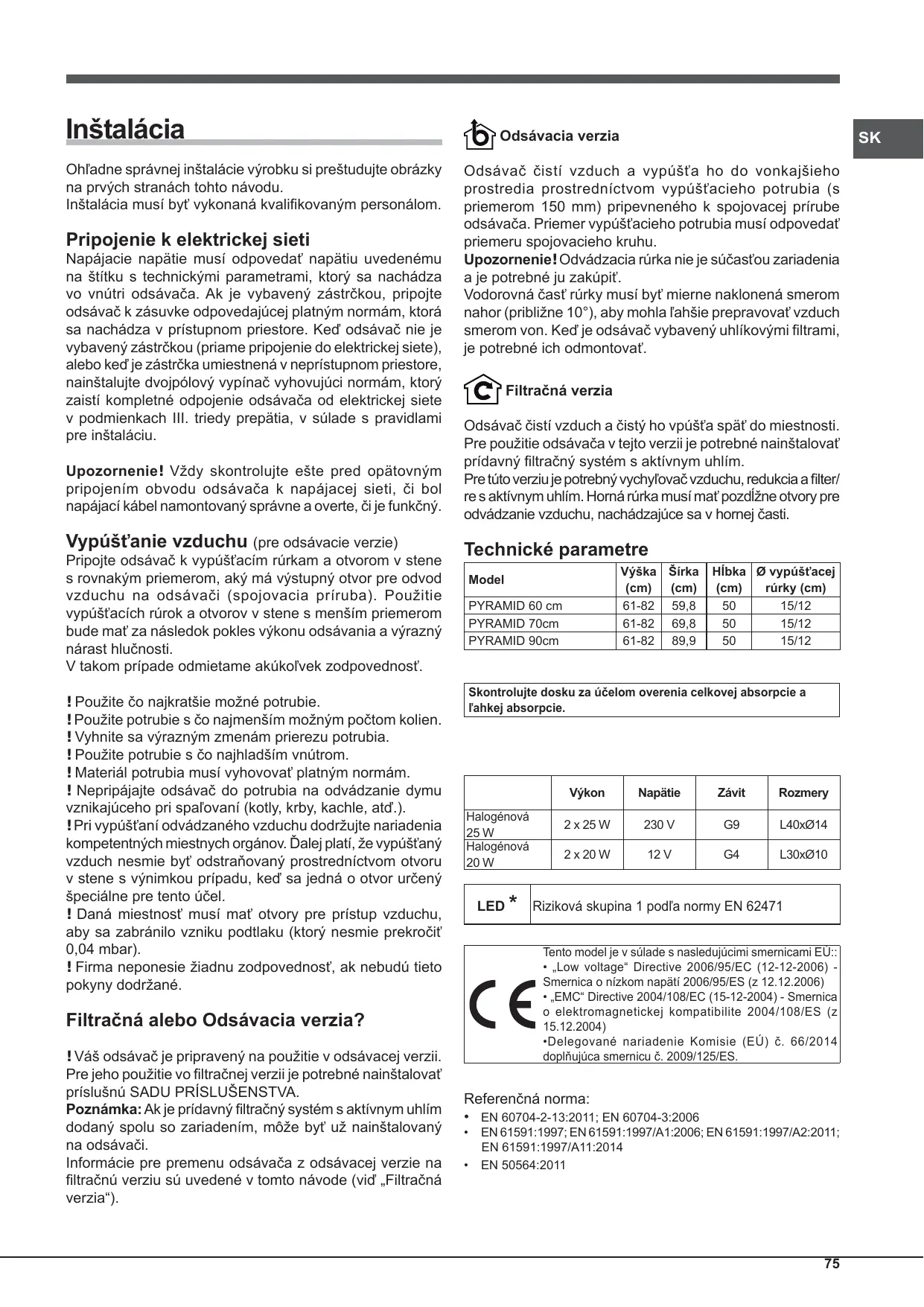 - Nedošlo k vypnutí omnipolárního zařízení. V případě případných poruch činnosti odpojte dříve, než se obrátíte na Servisní službu, zařízení nejméně na dobu 5 sekund od elektrického napájení odpojením zástrčky ze zásuvky elektrické sítě a poté jej znovu připojte. V případě přetrvávání poruchy činnosti se obraťte na servisní službu. Inštalácia Ohľadne správnej inštalácie výrobku si preštudujte obrázky na prvých stranách tohto návodu. Inštalácia musí byť vykonaná kvalifikovaným personálom. Pripojenie k elektrickej sieti Napájacie napätie musí odpovedať napätiu uvedenému na štítku s technickými parametrami, ktorý sa nachádza vo vnútri odsávača. Ak je vybavený zástrčkou, pripojte odsávač k zásuvke odpovedajúcej platným normám, ktorá sa nachádza v prístupnom priestore. Keď odsávač nie je vybavený zástrčkou (priame pripojenie do elektrickej siete), alebo keď je zástrčka umiestnená v neprístupnom priestore, nainštalujte dvojpólový vypínač vyhovujúci normám, ktorý zaistí kompletné odpojenie odsávača od elektrickej siete v podmienkach III. triedy prepätia, v súlade s pravidlami pre inštaláciu. Upozornenie! Vždy skontrolujte ešte pred opätovným pripojením obvodu odsávača k napájacej sieti, či bol napájací kábel namontovaný správne a overte, či je funkčný. Vypúšťanie vzduchu (pre odsávacie verzie) Pripojte odsávač k vypúšťacím rúrkam a otvorom v stene s rovnakým priemerom, aký má výstupný otvor pre odvod vzduchu na odsávači (spojovacia príruba). Použitie vypúšťacích rúrok a otvorov v stene s menším priemerom bude mať za následok pokles výkonu odsávania a výrazný nárast hlučnosti. V takom prípade odmietame akúkoľvek zodpovednosť. ! Použite čo najkratšie možné potrubie. ! Použite potrubie s čo najmenším možným počtom kolien. ! Vyhnite sa výrazným zmenám prierezu potrubia. ! Použite potrubie s čo najhladším vnútrom. ! Materiál potrubia musí vyhovovať platným normám. ! Nepripájajte odsávač do potrubia na odvádzanie dymu vznikajúceho pri spaľovaní (kotly, krby, kachle, atď.). ! Pri vypúšťaní odvádzaného vzduchu dodržujte nariadenia kompetentných miestnych orgánov. Ďalej platí, že vypúšťaný vzduch nesmie byť odstraňovaný prostredníctvom otvoru v stene s výnimkou prípadu, keď sa jedná o otvor určený špeciálne pre tento účel. ! Daná miestnosť musí mať otvory pre prístup vzduchu, aby sa zabránilo vzniku podtlaku (ktorý nesmie prekročiť 0,04 mbar). ! Firma neponesie žiadnu zodpovednosť, ak nebudú tieto pokyny dodržané. Odsávacia verzia Odsávač čistí vzduch a vypúšťa ho do vonkajšieho prostredia prostredníctvom vypúšťacieho potrubia (s priemerom 150 mm) pripevneného k spojovacej prírube odsávača. Priemer vypúšťacieho potrubia musí odpovedať priemeru spojovacieho kruhu. Upozornenie! Odvádzacia rúrka nie je súčasťou zariadenia a je potrebné ju zakúpiť. Vodorovná časť rúrky musí byť mierne naklonená smerom nahor (približne 10°), aby mohla ľahšie prepravovať vzduch smerom von. Keď je odsávač vybavený uhlíkovými filtrami, je potrebné ich odmontovať. Filtračná verzia Odsávač čistí vzduch a čistý ho vpúšťa späť do miestnosti. Pre použitie odsávača v tejto verzii je potrebné nainštalovať prídavný filtračný systém s aktívnym uhlím. Pre túto verziu je potrebný vychyľovač vzduchu, redukcia a filter/ re s aktívnym uhlím. Horná rúrka musí mať pozdĺžne otvory pre odvádzanie vzduchu, nachádzajúce sa v hornej časti. Technické parametre Výška Šírka (cm) (cm) 61-82 59,8 61-82 69,8 61-82 89,9 Model PYRAMID 60 cm PYRAMID 70cm PYRAMID 90cm Hĺbka Ø vypúšťacej (cm) rúrky (cm) 15/12 15/12 15/12 Skontrolujte dosku za účelom overenia celkovej absorpcie a ľahkej absorpcie. Halogénová 25 W Halogénová 20 W LED * Výkon Napätie Závit Rozmery 2 x 25 W 230 V