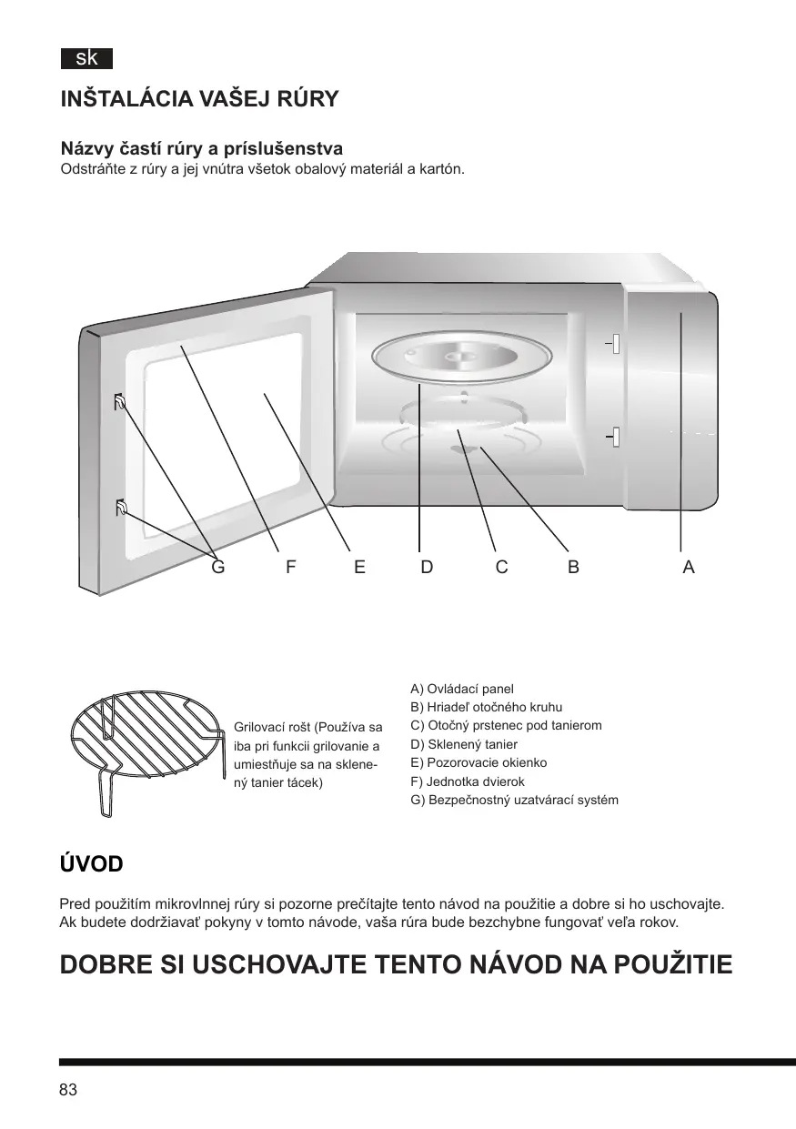 ÚVOD Pred použitím mikrovlnnej rúry si pozorne prečítajte tento návod na použitie a dobre si ho uschovajte. Ak budete dodržiavať pokyny v tomto návode, vaša rúra bude bezchybne fungovať veľa rokov.