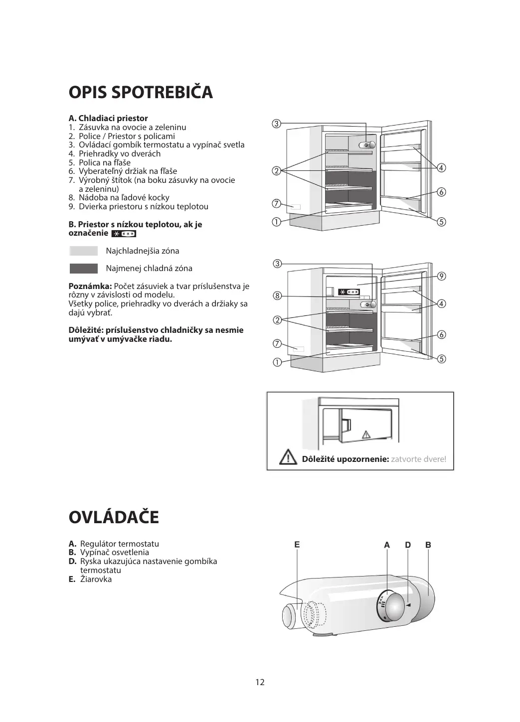 B. Priestor s nízkou teplotou, ak je označenie Najchladnejšia zóna Najmenej chladná zóna Poznámka: Počet zásuviek a tvar príslušenstva je rôzny v závislosti od modelu. Všetky police, priehradky vo dverách a držiaky sa dajú vybrať. Dôležité: príslušenstvo chladničky sa nesmie umývať v umývačke riadu. Dôležité upozornenie: zatvorte dvere!