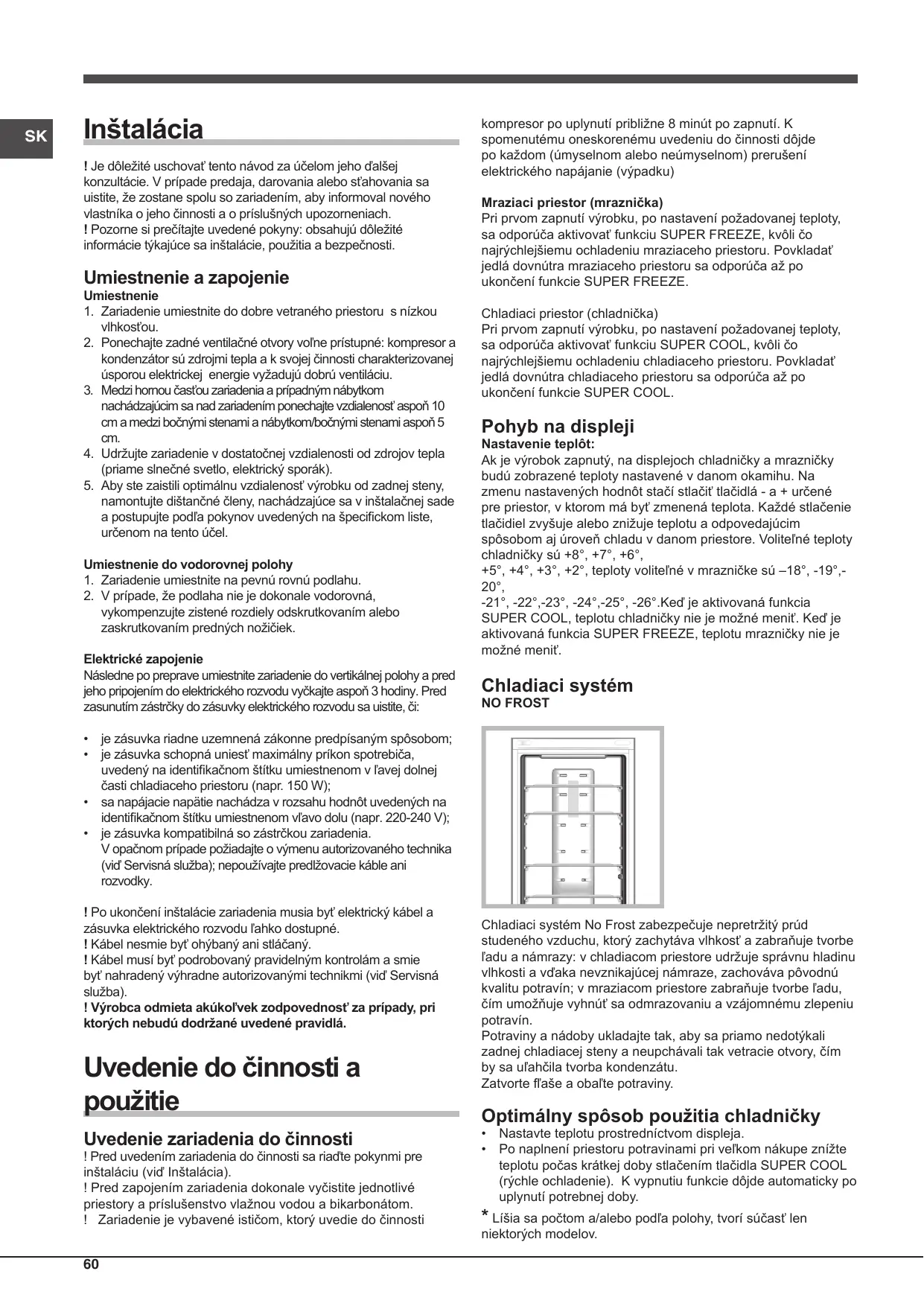 vykompenzujte zistené rozdiely odskrutkovaním alebo zaskrutkovaním predných nožičiek. Elektrické zapojenie Následne po preprave umiestnite zariadenie do vertikálnej polohy a pred jeho pripojením do elektrického rozvodu vyčkajte aspoň 3 hodiny. Pred zasunutím zástrčky do zásuvky elektrického rozvodu sa uistite, či: kompresor po uplynutí približne 8 minút po zapnutí. K spomenutému oneskorenému uvedeniu do činnosti dôjde po každom (úmyselnom alebo neúmyselnom) prerušení elektrického napájanie (výpadku) Mraziaci priestor (mraznička) Pri prvom zapnutí výrobku, po nastavení požadovanej teploty, sa odporúča aktivovať funkciu SUPER FREEZE, kvôli čo najrýchlejšiemu ochladeniu mraziaceho priestoru. Povkladať jedlá dovnútra mraziaceho priestoru sa odporúča až po ukončení funkcie SUPER FREEZE. Chladiaci priestor (chladnička) Pri prvom zapnutí výrobku, po nastavení požadovanej teploty, sa odporúča aktivovať funkciu SUPER COOL, kvôli čo najrýchlejšiemu ochladeniu chladiaceho priestoru. Povkladať jedlá dovnútra chladiaceho priestoru sa odporúča až po ukončení funkcie SUPER COOL. Pohyb na displeji Nastavenie teplôt: Ak je výrobok zapnutý, na displejoch chladničky a mrazničky budú zobrazené teploty nastavené v danom okamihu. Na zmenu nastavených hodnôt stačí stlačiť tlačidlá - a + určené pre priestor, v ktorom má byť zmenená teplota. Každé stlačenie tlačidiel zvyšuje alebo znižuje teplotu a odpovedajúcim spôsobom aj úroveň chladu v danom priestore. Voliteľné teploty chladničky sú +8°, +7°, +6°, +5°, +4°, +3°, +2°, teploty voliteľné v mrazničke sú –18°, -19°,20°, -21°, -22°,-23°, -24°,-25°, -26°.Keď je aktivovaná funkcia SUPER COOL, teplotu chladničky nie je možné meniť. Keď je aktivovaná funkcia SUPER FREEZE, teplotu mrazničky nie je možné meniť. Chladiaci systém NO FROST