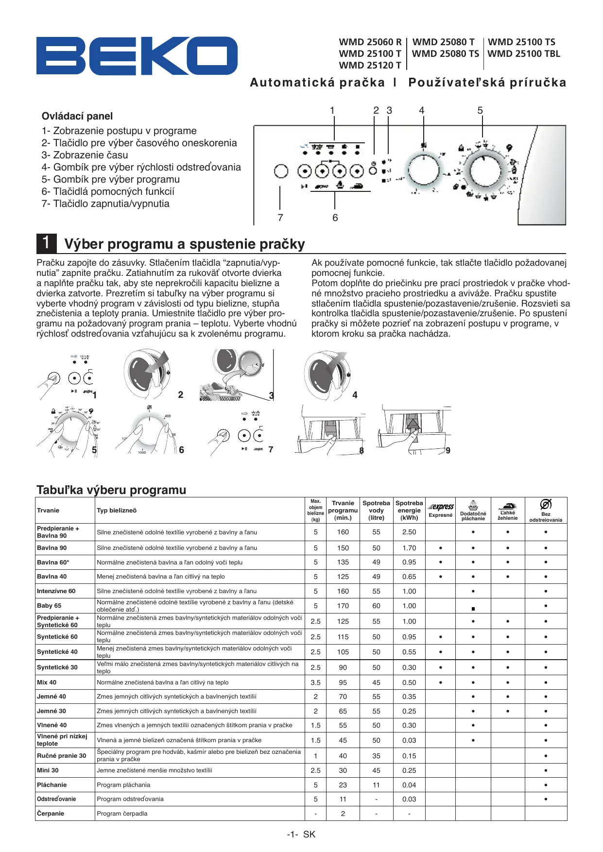 A utomatická pračka | Používateľská p r í r u č k a Ovládací panel
