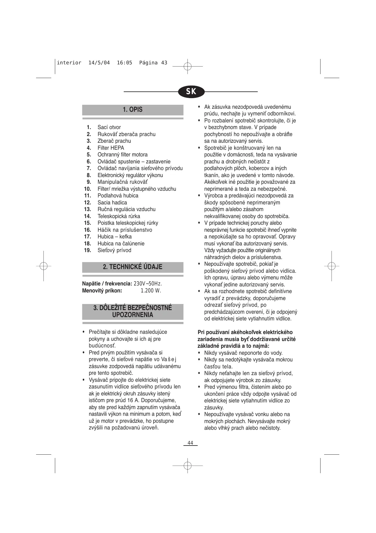 - Spotrebič je konštruovaný len na použitie v domácnosti, teda na vysávanie prachu a drobných nečistôt z podlahových plôch, kobercov a iných tkanín, ako je uvedené v tomto návode. Akékoľvek iné použitie je považované za neprimerané a teda za nebezpečné.