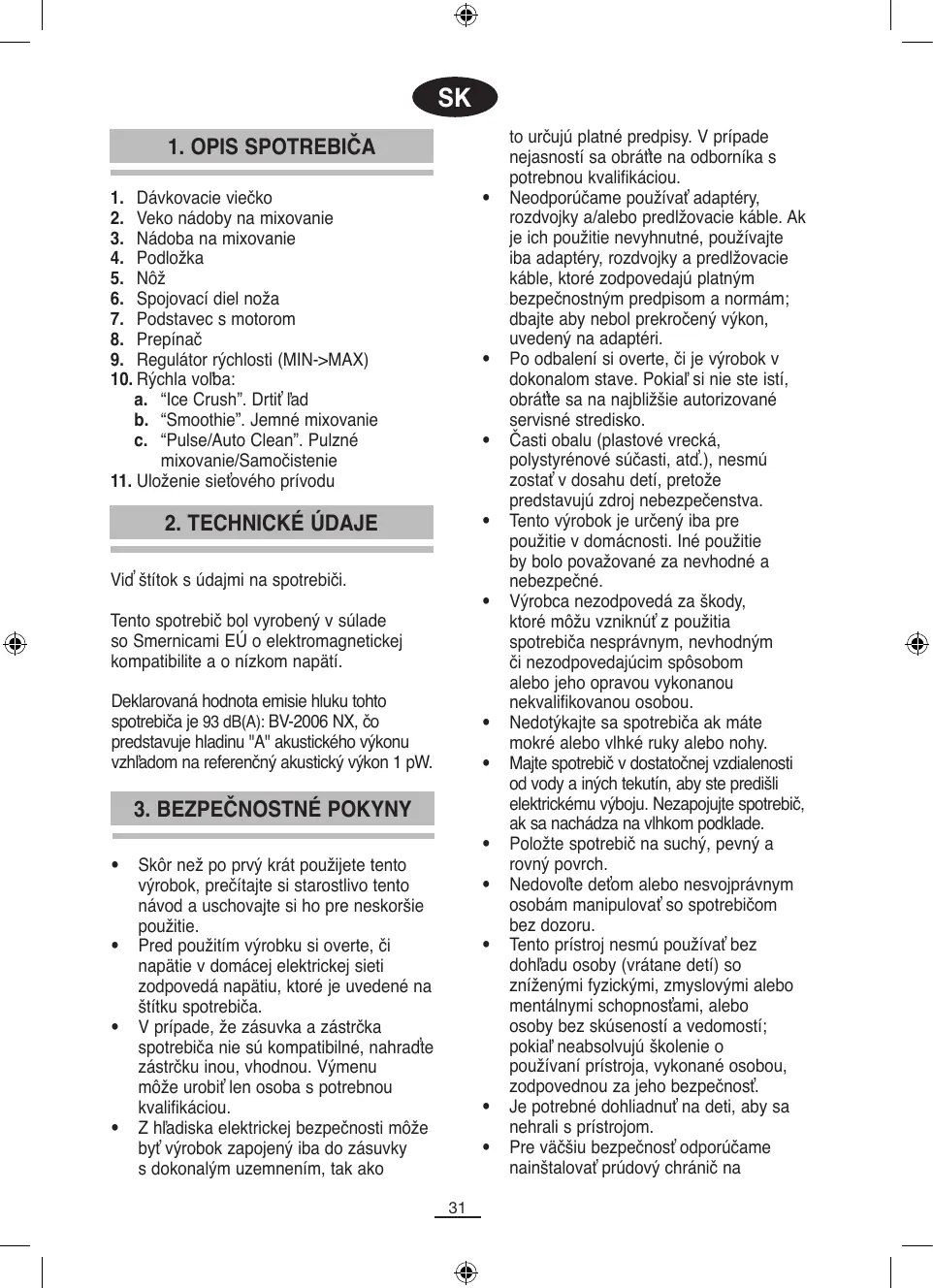 reziduálny prúd (RCD) s vybavovacím reziduálnym prúdom, ktorý neprekračuje 30 mA. Poraďte sa s odborníkom na inštaláciu. Nenechávajte zapnutý spotrebič bez dozoru, pretože môže byť zdrojom nebezpečenstva. Pri odpojení sieťového prívodného kábla nikdy neťahajte za samotný kábel. Odpojte spotrebič zo siete pred každou operáciou súvisiacou s čistením alebo údržbou. V prípade poruchy a/alebo nesprávneho fungovania spotrebič vypnite a nepokúšajte sa ho opraviť. V prípade, že je potrebná oprava, obráťte sa výlučne na výrobcom autorizovaný servis a žiadajte, aby boli použité originálne náhradné diely. V prípade, že je kábel poškodený alebo je potrebné ho vymeniť, obráťte sa výlučne na výrobcom autorizovaný servis. Nevystavujte spotrebič atmosférickým vplyvom (dážď, slnko, ľad, a pod.). Nepoužívajte spotrebič ani žiadnu jeho časť na teplých povrchoch ani v ich blízkosti, ani ho na ne neklaďte (plynové alebo elektrické horáky, alebo rúry). Na čistenie spotrebiča nepoužívajte abrazívne (drsné) čistiace prostriedky, hubky alebo handričky. Nedotýkajte sa horúcich povrchov. Použite rukoväte alebo držadlá. Dbajte na to, aby sa sieťový prívodný kábel nedotýkal horúcich častí spotrebiča. Nôž je veľmi ostrý, narábajte s ním opatrne, aby ste sa neporezali. Nenapĺňajte nádobu viac než po značku maximum. Neskladajte nádobu z podstavca kým je mixér v chode. Vždy používajte mixér so správne nasadeným vekom nádoby. Nevkladajte ruky ani žiadne predmety do nádoby kým je mixér v chode. Ak je to potrebné, mixér vypojte a použite stierku na odstránenie potravín prilepených na stenách nádoby. Podstavec s motorom neponárajte do vody ani do žiadnej inej tekutiny.