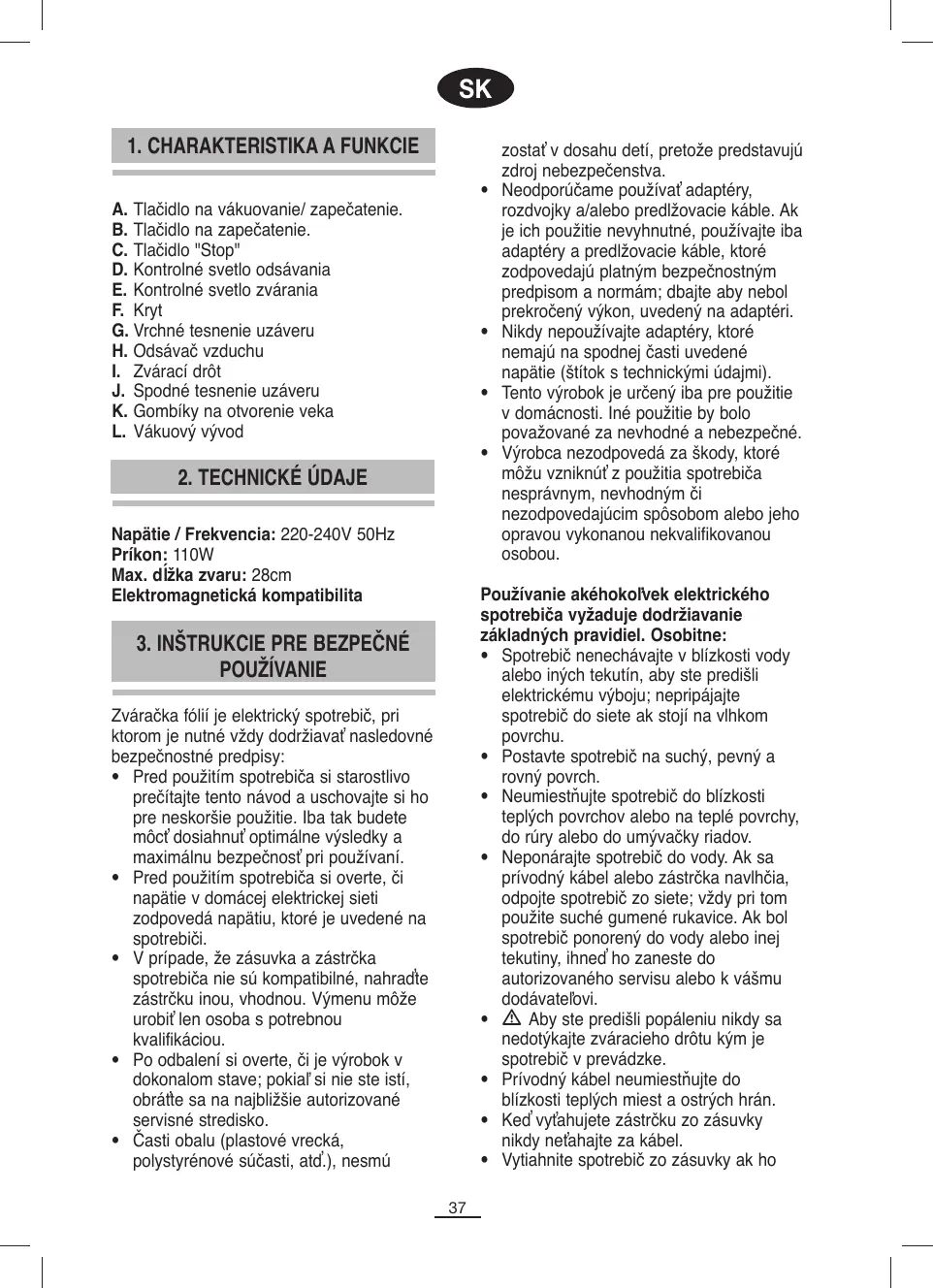 3. INŠTRUKCIE PRE BEZPEČNÉ POUŽÍVANIE Zváračka fólií je elektrický spotrebič, pri ktorom je nutné vždy dodržiavať nasledovné bezpečnostné predpisy: • Pred použitím spotrebiča si starostlivo prečítajte tento návod a uschovajte si ho pre neskoršie použitie. Iba tak budete môcť dosiahnuť optimálne výsledky a maximálnu bezpečnosť pri používaní. • Pred použitím spotrebiča si overte, či napätie v domácej elektrickej sieti zodpovedá napätiu, ktoré je uvedené na spotrebiči. • V prípade, že zásuvka a zástrčka spotrebiča nie sú kompatibilné, nahraďte zástrčku inou, vhodnou. Výmenu môže urobiť len osoba s potrebnou kvalifikáciou. • Po odbalení si overte, či je výrobok v dokonalom stave; pokiaľ si nie ste istí, obráťte sa na najbližšie autorizované servisné stredisko. • Časti obalu (plastové vrecká, polystyrénové súčasti, atď.), nesmú 37