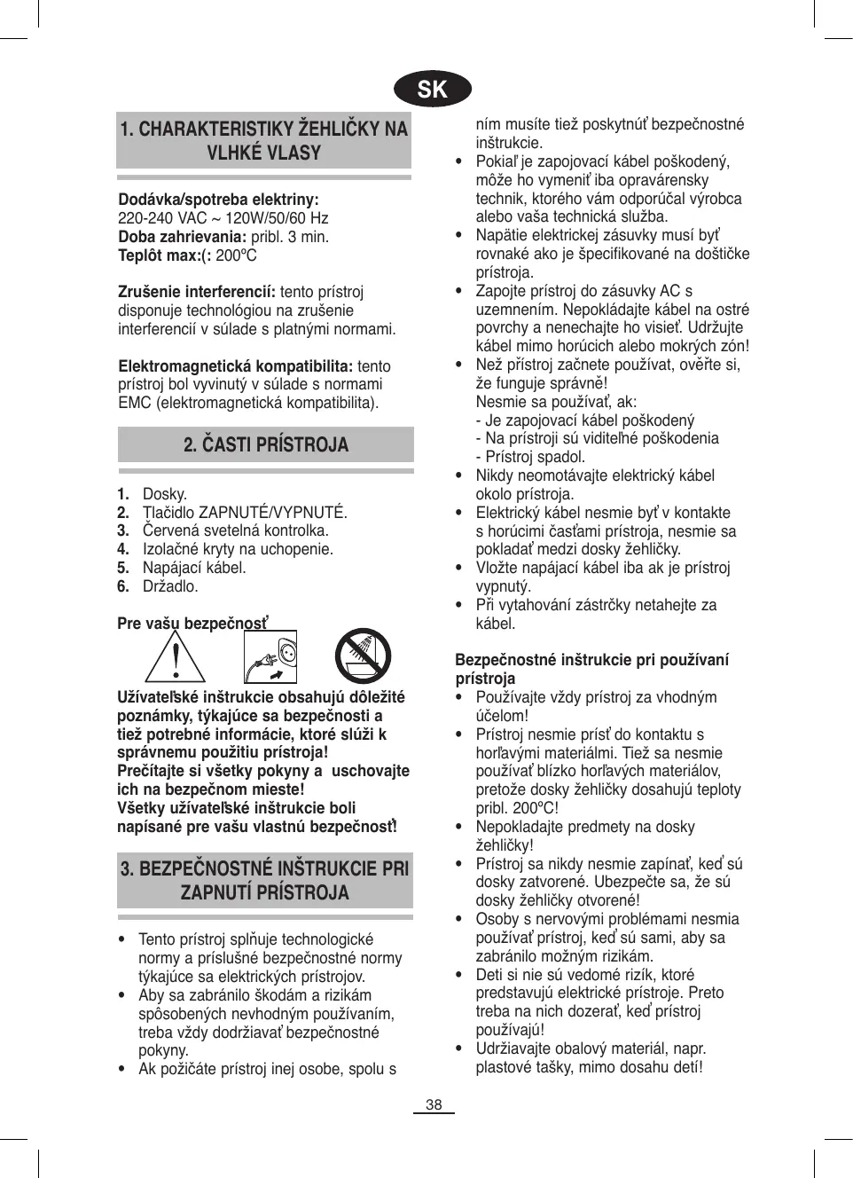 Pre vašu bezpečnosť ním musíte tiež poskytnúť bezpečnostné inštrukcie. Pokiaľ je zapojovací kábel poškodený, môže ho vymeniť iba opravárensky technik, ktorého vám odporúčal výrobca alebo vaša technická služba. Napätie elektrickej zásuvky musí byť rovnaké ako je špecifikované na doštičke prístroja. Zapojte prístroj do zásuvky AC s uzemnením. Nepokládajte kábel na ostré povrchy a nenechajte ho visieť. Udržujte kábel mimo horúcich alebo mokrých zón! Než přístroj začnete používat, ověřte si, že funguje správně! Nesmie sa používať, ak: - Je zapojovací kábel poškodený - Na prístroji sú viditeľné poškodenia - Prístroj spadol. Nikdy neomotávajte elektrický kábel okolo prístroja. Elektrický kábel nesmie byť v kontakte s horúcimi časťami prístroja, nesmie sa pokladať medzi dosky žehličky. Vložte napájací kábel iba ak je prístroj vypnutý. Při vytahování zástrčky netahejte za kábel. Bezpečnostné inštrukcie pri používaní prístroja