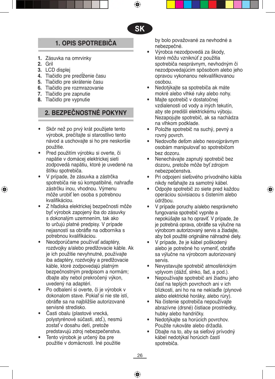 by bolo považované za nevhodné a nebezpečné. Výrobca nezodpovedá za škody, ktoré môžu vzniknúť z použitia spotrebiča nesprávnym, nevhodným či nezodpovedajúcim spôsobom alebo jeho opravou vykonanou nekvalifikovanou osobou. Nedotýkajte sa spotrebiča ak máte mokré alebo vlhké ruky alebo nohy. Majte spotrebič v dostatočnej vzdialenosti od vody a iných tekutín, aby ste predišli elektrickému výboju. Nezapojujte spotrebič, ak sa nachádza na vlhkom podklade. Položte spotrebič na suchý, pevný a rovný povrch. Nedovoľte deťom alebo nesvojprávnym osobám manipulovať so spotrebičom bez dozoru. Nenechávajte zapnutý spotrebič bez dozoru, pretože môže byť zdrojom nebezpečenstva. Pri odpojení sieťového prívodného kábla nikdy neťahajte za samotný kábel. Odpojte spotrebič zo siete pred každou operáciou súvisiacou s čistením alebo údržbou. V prípade poruchy a/alebo nesprávneho fungovania spotrebič vypnite a nepokúšajte sa ho opraviť. V prípade, že je potrebná oprava, obráťte sa výlučne na výrobcom autorizovaný servis a žiadajte, aby boli použité originálne náhradné diely. V prípade, že je kábel poškodený alebo je potrebné ho vymeniť, obráťte sa výlučne na výrobcom autorizovaný servis. Nevystavujte spotrebič atmosférickým vplyvom (dážď, slnko, ľad, a pod.). Nepoužívajte spotrebič ani žiadnu jeho časť na teplých povrchoch ani v ich blízkosti, ani ho na ne neklaďte (plynové alebo elektrické horáky, alebo rúry). Na čistenie spotrebiča nepoužívajte abrazívne (drsné) čistiace prostriedky, hubky alebo handričky. Nedotýkajte sa horúcich povrchov. Použite rukoväte alebo držadlá. Dbajte na to, aby sa sieťový prívodný kábel nedotýkal horúcich častí spotrebiča.