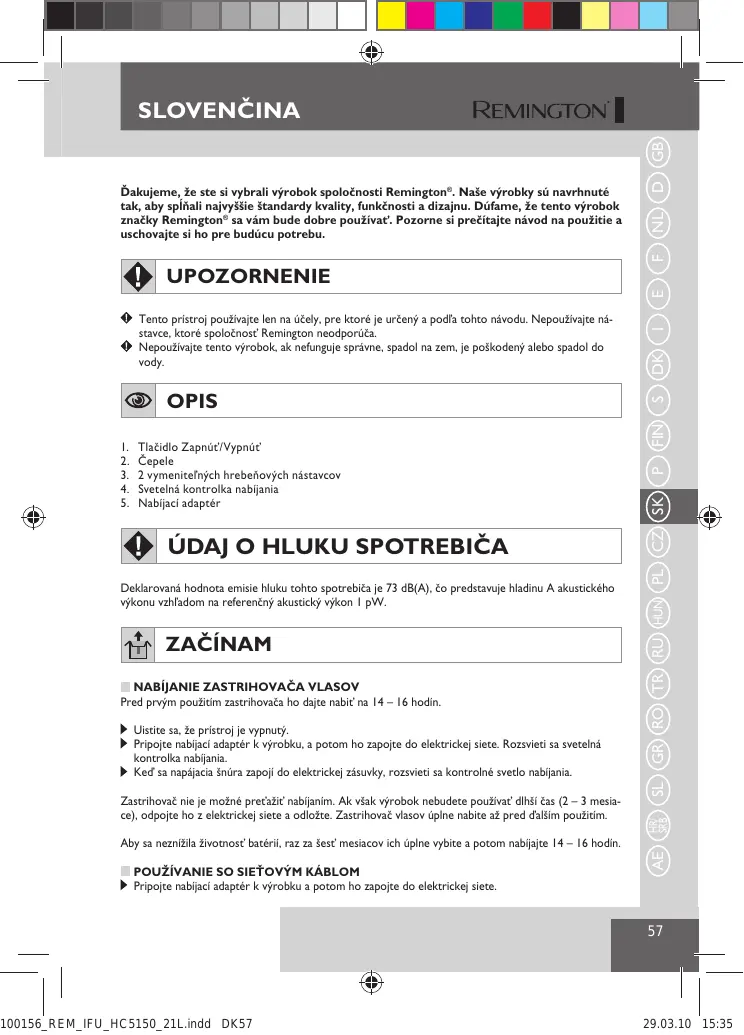 UPOZORNENIE – ZNIŽOVANIE RIZIKA POPÁLENIA, SMRTI SPÔSOBENEJ ELEKTRICKÝM PRÚDOM, POŽIARU ALEBO ZRANENIA OSÔB: Nikdy nenechávajte prístroj bez dozoru, keď je zapojený do elektrickej siete. Sieťový kábel a zástrčku nepokladajte na horúce povrchy. Zabezpečte, aby sieťový kábel a zástrčka neboli mokré. Nezapájajte alebo neodpájajte výrobok z elektrickej siete mokrými rukami. Nabíjací adaptér nepoužívajte s poškodenou napájacou šnúrou. Náhradný diel si môžete objednať cez naše servisné stredisko Remington®.