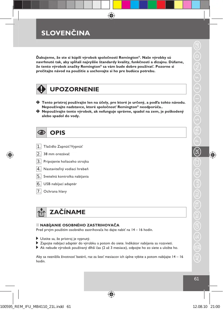 Ďakujeme, že ste si kúpili výrobok spoločnosti Remington®. Naše výrobky sú navrhnuté tak, aby spĺňali najvyššie štandardy kvality, funkčnosti a dizajnu. Dúfame, že tento výrobok značky Remington® sa vám bude dobre používať. Pozorne si prečítajte návod na použitie a uschovajte si ho pre budúcu potrebu.