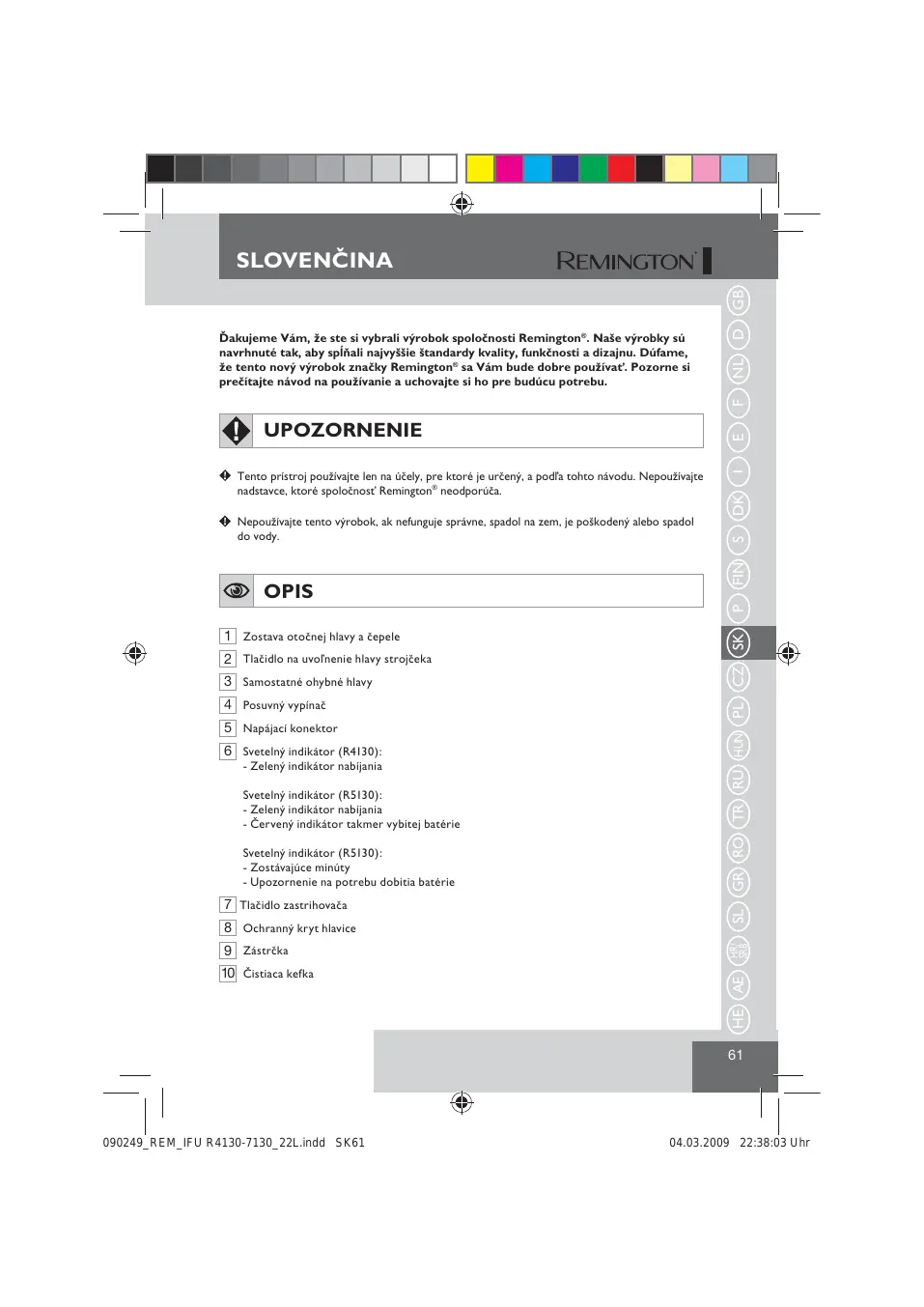 Ďakujeme Vám, že ste si vybrali výrobok spoločnosti Remington®. Naše výrobky sú navrhnuté tak, aby spĺňali najvyššie štandardy kvality, funkčnosti a dizajnu. Dúfame, že tento nový výrobok značky Remington® sa Vám bude dobre používať. Pozorne si prečítajte návod na používanie a uchovajte si ho pre budúcu potrebu.