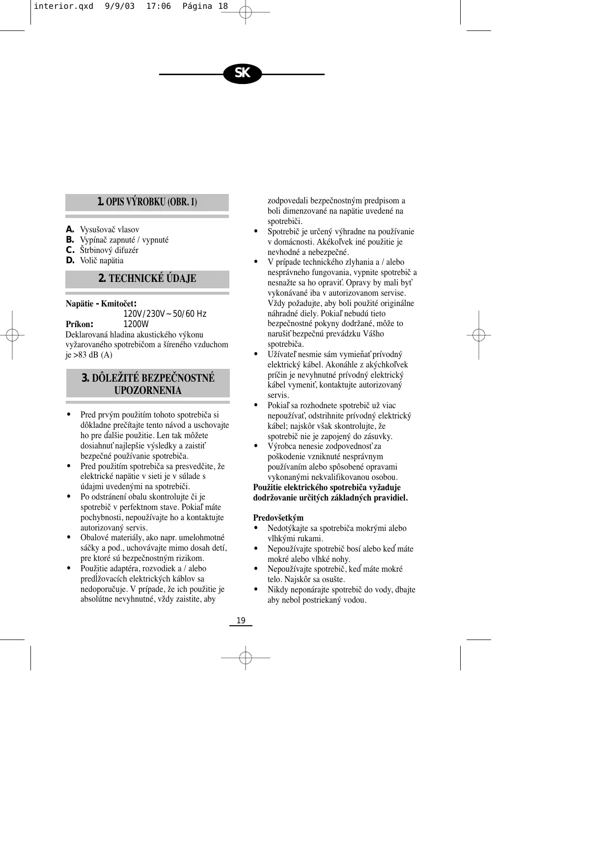 Doležite: Tento model je možné pomocou volica napatia nastavit'pre napatie: 120V až 230V . Pred použitím spotrebica sa uistite, ze zvolené nestavenie pre napatie zodpovedá napatiu v sieti. Chyba v nastavení napatia moze spôsobit neopravitelné škody na Vašom spotrebici.