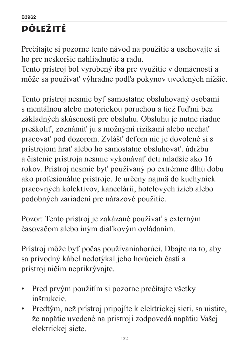 Prečítajte si pozorne tento návod na použitie a uschovajte si ho pre neskoršie nahliadnutie a radu. Tento prístroj bol vyrobený iba pre využitie v domácnosti a môže sa používať výhradne podľa pokynov uvedených nižšie. Tento prístroj nesmie byť samostatne obsluhovaný osobami s mentálnou alebo motorickou poruchou a tiež ľuďmi bez základných skúseností pre obsluhu. Obsluhu je nutné riadne preškoliť, zoznámiť ju s možnými rizikami alebo nechať pracovať pod dozorom. Zvlášť deťom nie je dovolené si s prístrojom hrať alebo ho samostatne obsluhovať. údržbu a čistenie prístroja nesmie vykonávať deti mladšie ako 16 rokov. Prístroj nesmie byť používaný po extrémne dlhú dobu ako profesionálne prístroje. Je určený najmä do kuchyniek pracovných kolektívov, kancelárií, hotelových izieb alebo podobných zariadení pre nárazové použitie. Pozor: Tento prístroj je zakázané používať s externým časovačom alebo iným diaľkovým ovládaním. Prístroj môže byť počas používaniahorúci. Dbajte na to, aby sa prívodný kábel nedotýkal jeho horúcich častí a prístroj ničím neprikrývajte.