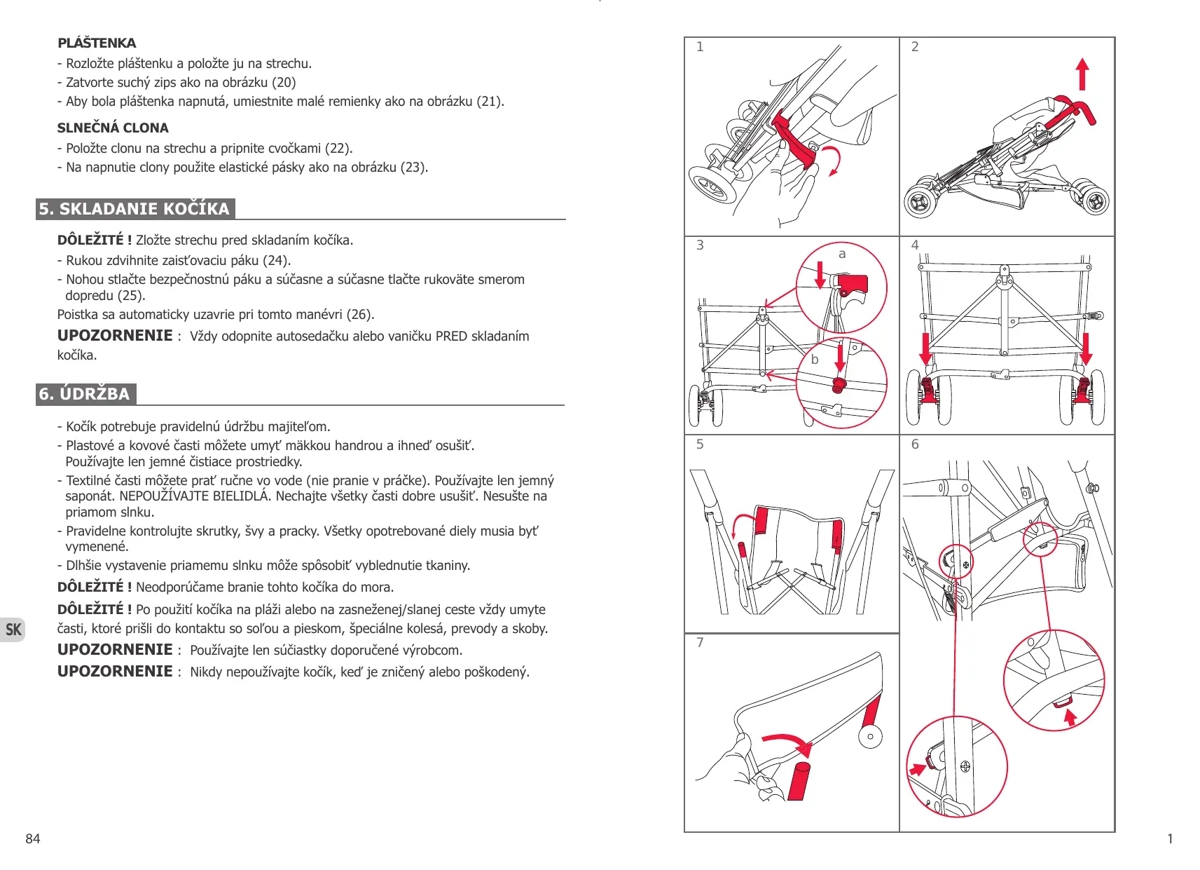 DÔLEŽITÉ ! Neodporúčame branie tohto kočíka do mora. DÔLEŽITÉ ! Po použití kočíka na pláži alebo na zasneženej/slanej ceste vždy umyte časti, ktoré prišli do kontaktu so soľou a pieskom, špeciálne kolesá, prevody a skoby.