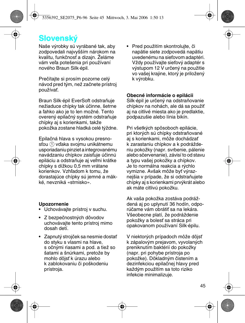 Tento pfiístroj odpovídá pfiedpisÛm o odru‰ení (smûrnice ES 89/336/EEC) a smûrnici o nízkém napûtí (73/23 EEC). Po skonãení Ïivotnosti neodhazujte prosím tento v˘robek do bûÏného domovního odpadu. MÛÏete jej odevzdat do servisního stfiediska Braun nebo na pfiíslu‰ném sbûrném místû zfiízeném dle místních pfiedpisÛ. 5356392_SE2075_P6-96 Seite 45 Mittwoch, 3. Mai 2006 1:50 13 Slovensk˘ Na‰e v˘robky sú vyrábané tak, aby zodpovedali najvy‰‰ím nárokom na kvalitu, funkãnosÈ a dizajn. Îeláme vám veºa pote‰enia pri pouÏívaní nového Braun Silk·épil. Preãítajte si prosím pozorne cel˘ návod pred t˘m, neÏ zaãnete prístroj pouÏívaÈ. Braun Silk·épil EverSoft odstraÀuje neÏiaduce chípky tak úãinne, ‰etrne a ºahko ako je to len moÏné. Tento overen˘ epilaãn˘ systém odstraÀuje chípky aj s korienkami, takÏe pokoÏka zostane hladká celé t˘Ïdne. Epilaãná hlava s vysokou presnosÈou 1 vìaka svojmu unikátnemu usporiadaniu pinziet a integrovanému navádzaniu chípkov zaisÈuje úãinnú epiláciu a odstraÀuje aj veºmi krátke chípky s díÏkou 0,5 mm vrátane korienkov. Vzhºadom k tomu, Ïe dorastajúce chípky sú jemné a mäkké, nevzniká «strnisko». Upozornenie