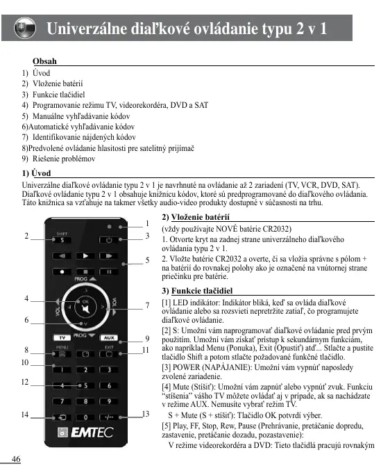 Univerzálne diaľkové ovládanie typu 2 v 1 Obsah