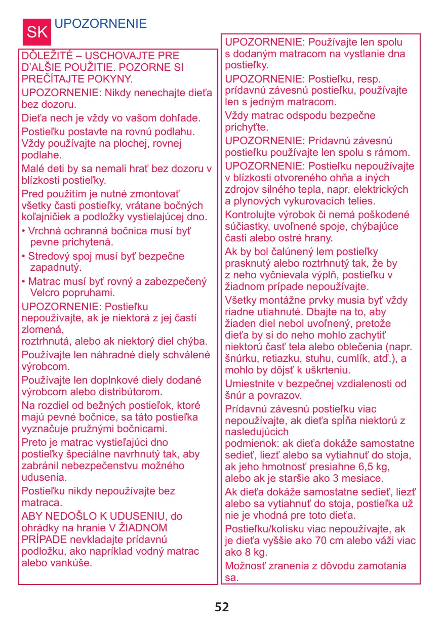 AVERTISSEMENT: Ne pas utiliser plus d’un matelas à la fois dans le berceau ou dans le rehausseur de matelas. Toujours utiliser le matelas sommier fourni, en le fixant avec les sangles situées en dessous. AVERTISSEMENT: Ne pas utiliser le rehausseur de matelas hors du berceau AVERTISSEMENT: Attention aux accidents liés aux flammes et autres sources de forte chaleur telles que radiateurs électriques, ou radiateurs à gaz, dans le voisinage du berceau. Vérifier le berceau pour détecter les parties abimées ou manquantes, et les bords acérés. Si les bords rembourrés sont déchirés et donnent un accès au rembourrage il faut arrêter d’utiliser le berceau. Tous les dispositifs de fixation doivent être correctement attachés. Faire attention à ce que le bébé n’ait pas une partie de son corps ou de ses vêtements (rubans, colliers) coincés, entrainant un risque d’étranglement. Mettre le berceau loin des cordons de téléphones ou de fils électriques. Arrêtez d’utiliser le rehausseur de matelas lorsque l’enfant vérifie une des conditions suivantes: l’enfant peut s’asseoir, se mettre à genoux ou se redresser tout seul, ou, à partir du moment où il pèse plus de 6,5 kg ou a plus de 3 mois. Lorsqu’un enfant est capable de s’asseoir, ou de se mettre à genoux, ou de se redresser tout seul, le berceau ne doit plus être utilisé pour cet enfant. Arrêtez d’utiliser le berceau lorsque l’enfant mesure 70 cm ou pèse plus de 8kg.