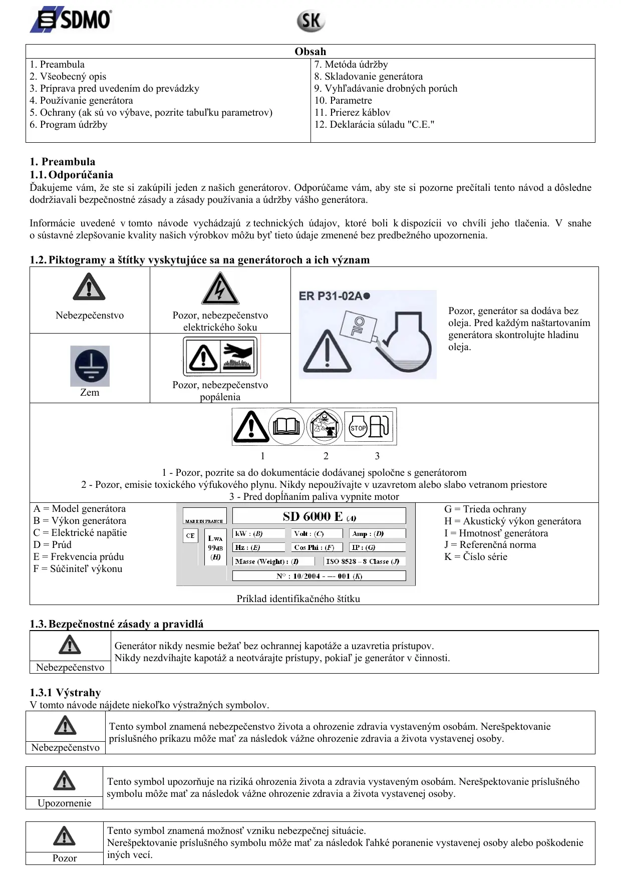 Jedným zo základných faktorov bezpečnosti je rešpektovanie intervalov údržby (pozrite tabuľku údržby). Z toho dôvodu nikdy neskúšajte vykonávať operácie opravy alebo údržby, ak nemáte dosť skúseností a/alebo potrebné nástroje. Pri preberaní vášho generátora skontrolujte jeho stav a kompletnosť dodávky. S agregátom treba manipulovať bez násilia a nárazov, pričom si treba dopredu pripraviť miesto na jeho skladovanie alebo používanie. Skôr ako začnete zariadenie používať, je potrebné sa oboznámiť so spôsobom jeho okamžitého zastavenia a dokonale pochopiť jeho ovládanie a manipuláciu. Upozornenie Nikdy nenechávajte iné osoby používať generátor, ak ste im neposkytli potrebné inštrukcie. Nikdy nedovoľte deťom dotýkať sa generátora, ani ak je vypnutý. Vyhýbajte sa prevádzkovaniu generátora v prítomnosti zvierat (rozrušenie, zľaknutie atď.) Nikdy neštartujte motor bez filtra alebo výfuku. Pri montáži nikdy nezamieňajte kladný a záporný pól akumulátorov (ak sú vo výbave). Zámena môže spôsobiť vážne poškodenie elektrického zariadenia. Generátor nikdy nezakrývajte počas prevádzky alebo tesne po zastavení (počkajte, kým motor vychladne). Generátor nikdy nenatierajte olejom s cieľom ochrany pred koróziou. Niektoré ochranné oleje sú horľavé. Navyše niektoré sú nebezpečné pri vdychovaní. V každom prípade rešpektujte miestne predpisy týkajúce sa používania generátorov.