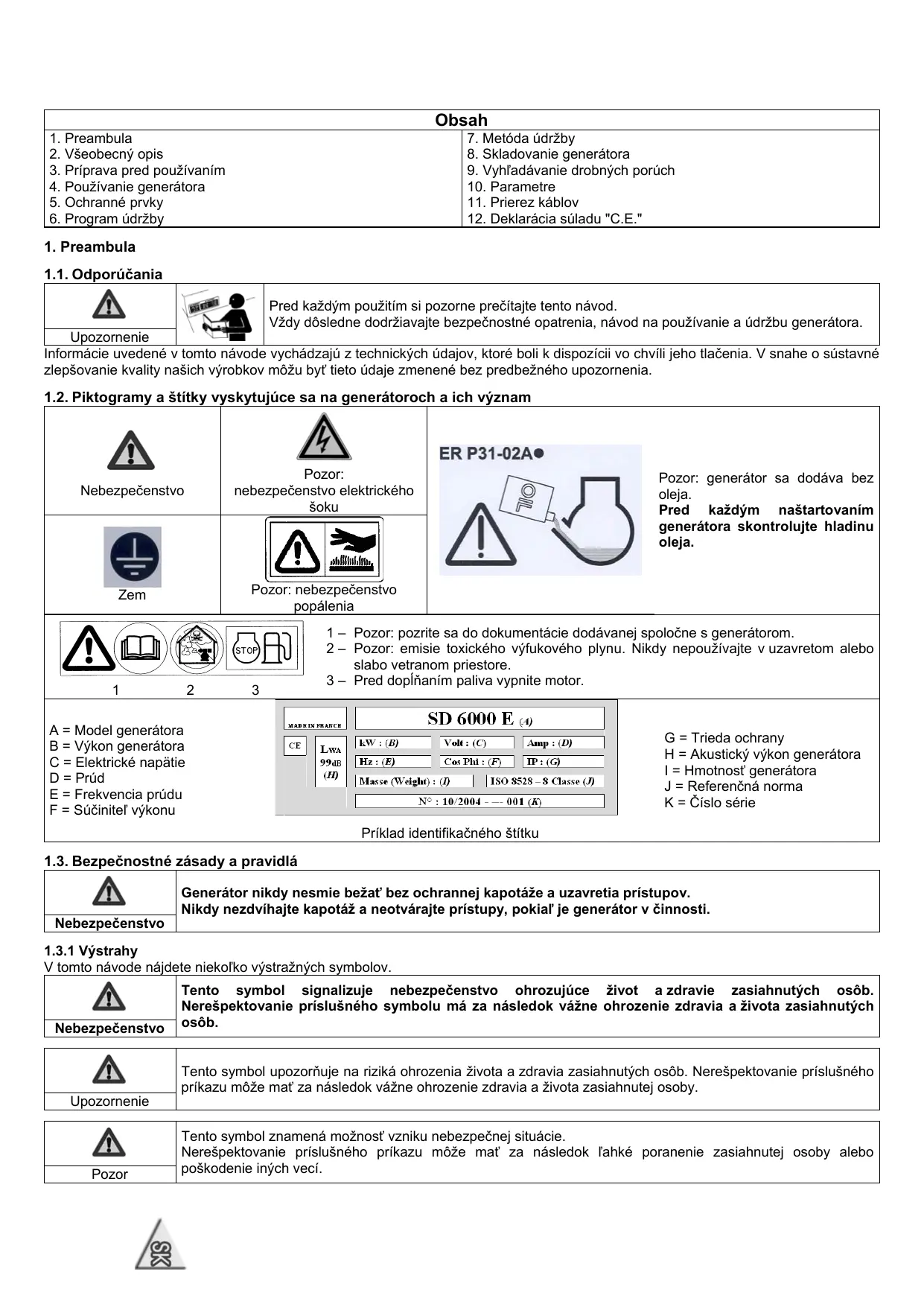 7. Metóda údržby 8. Skladovanie generátora 9. Vyhľadávanie drobných porúch 10. Parametre 11. Prierez káblov 12. Deklarácia súladu "C.E."