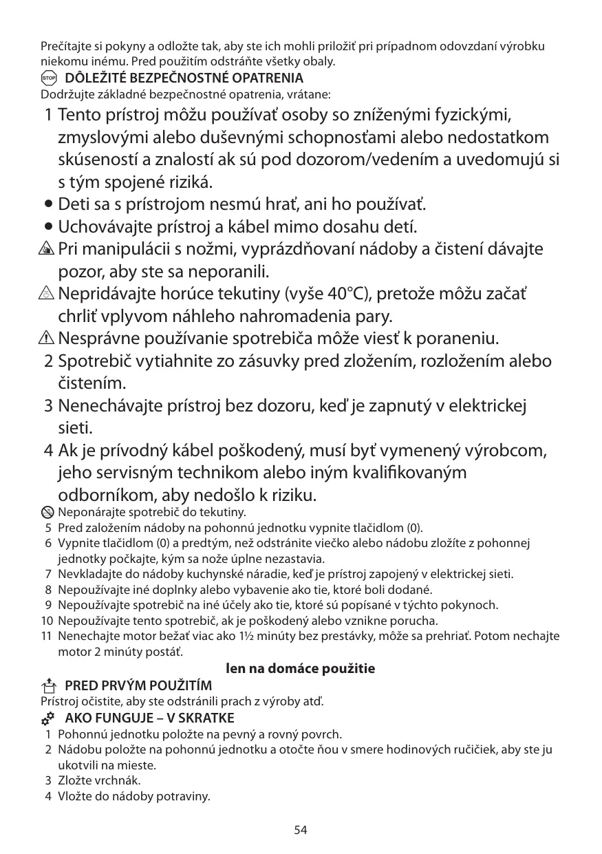 1 Tento prístroj môžu používať osoby so zníženými fyzickými, zmyslovými alebo duševnými schopnosťami alebo nedostatkom skúseností a znalostí ak sú pod dozorom/vedením a uvedomujú si s tým spojené riziká. • Deti sa s prístrojom nesmú hrať, ani ho používať. • Uchovávajte prístroj a kábel mimo dosahu detí. s Pri manipulácii s nožmi, vyprázdňovaní nádoby a čistení dávajte pozor, aby ste sa neporanili. u Nepridávajte horúce tekutiny (vyše 40°C), pretože môžu začať chrliť vplyvom náhleho nahromadenia pary. c Nesprávne používanie spotrebiča môže viesť k poraneniu. 2 Spotrebič vytiahnite zo zásuvky pred zložením, rozložením alebo čistením. 3 Nenechávajte prístroj bez dozoru, keď je zapnutý v elektrickej sieti. 4 Ak je prívodný kábel poškodený, musí byť vymenený výrobcom, jeho servisným technikom alebo iným kvalifikovaným odborníkom, aby nedošlo k riziku. H Neponárajte spotrebič do tekutiny. 5 Pred založením nádoby na pohonnú jednotku vypnite tlačidlom (0). 6 Vypnite tlačidlom (0) a predtým, než odstránite viečko alebo nádobu zložíte z pohonnej jednotky počkajte, kým sa nože úplne nezastavia. 7 Nevkladajte do nádoby kuchynské náradie, keď je prístroj zapojený v elektrickej sieti. 8 Nepoužívajte iné doplnky alebo vybavenie ako tie, ktoré boli dodané. 9 Nepoužívajte spotrebič na iné účely ako tie, ktoré sú popísané v týchto pokynoch. 10 Nepoužívajte tento spotrebič, ak je poškodený alebo vznikne porucha. 11 Nenechajte motor bežať viac ako 1½ minúty bez prestávky, môže sa prehriať. Potom nechajte motor 2 minúty postáť.