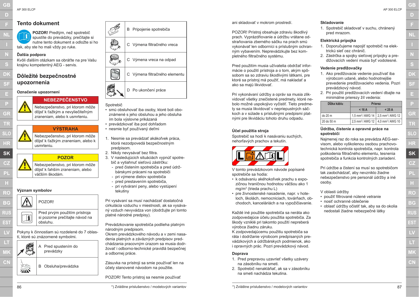 AP 300 ELCP AP 300 ELCP Tento dokument POZOR! Predtým, než spotrebič spustíte do prevádzky, prečítajte si nutne tento dokument a odložte si ho tak, aby ste ho mali vždy po ruke. Ďalšia podpora Kvôli ďalším otázkam sa obráťte na pre Vašu krajinu kompetentný AEG - servis. Označenie upozornení D Po ukončení práce NEBEZPEČENSTVO Nebezpečenstvo, pri ktorom môže dôjsť k ťažkým a nevyliečiteľným zraneniam, alebo k usmrteniu.
