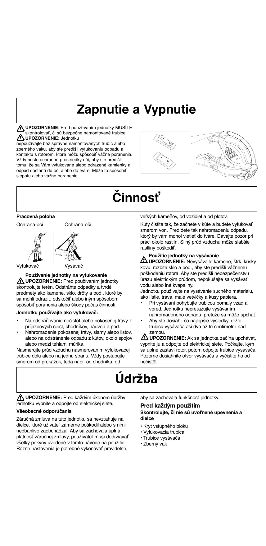 Zapnutie a Vypnutie UPOZORNENIE: Pred použí-vaním jednotky MUSÍTE skontrolovať, či sú bezpečne namontované trubice. UPOZORNENIE: Jednotku nepoužívajte bez správne namontovaných trubíc alebo zberného vaku, aby ste predišli vyfukovaniu odpadu a kontaktu s rotorom, ktoré môžu spôsobiť vážne poranenia. Vždy noste ochranné prostriedky očí, aby ste predišli tomu, že sa Vám vyfukované alebo odrazené kamienky a odpad dostanú do očí alebo do tváre. Môže to spôsobiť slepotu alebo vážne poranenie. Činnosť veľkých kameňov, od vozidiel a od plotov. Pracovná poloha Ochrana očí Vyfukovač Kúty čistite tak, že začnete v kúte a budete vyfukovať smerom von. Predídete tak nahromadeniu odpadu, ktorý by vám mohol vletieť do tváre. Dávajte pozor pri práci okolo rastlín. Silný prúd vzduchu môže slabšie rastliny poškodiť. Ochrana očí Vysávač Používanie jednotky na vyfukovanie UPOZORNENIE: Pred používaním jednotky skontrolujte terén. Odstráňte odpadky a tvrdé predmety ako kamene, sklo, drôty a pod., ktoré by sa mohli odraziť, odskočiť alebo iným spôsobom spôsobiť poranenia alebo škody počas činnosti. Jednotku používajte ako vyfukovač: