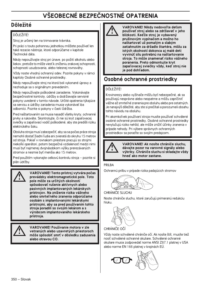 VAROVANIE! Tento prístroj vytvára poãas prevádzky elektromagnetické pole. Toto pole môÏe za urãit˘ch okolností spôsobovaÈ ru‰enie aktívnych alebo pasivn˘ch implantovan˘ch lekárskych prístrojov. Na zníÏenie rizika váÏneho alebo smrteºného zranenia odporúãame osobám s implantovan˘mi lekárskymi prístrojmi, aby sa pred pouÏívaním tohto stroja poradili so svojím lekárom a s v˘robcom implantovaného lekárskeho prístroja. VAROVANIE! PouÏívanie motora v zle vetran˘ch alebo uzavret˘ch priestoroch môÏe spôsobiÈ smrÈ v dôsledku zadusenia alebo otravou CO. 350 – Slovak VAROVANIE! Nikdy nedovoºte deÈom pouÏívaÈ stroj alebo sa zdrÏiavaÈ v jeho blízkosti. KeìÏe stroj je vybaven˘ pruÏinov˘m vypínaãom a moÏno ho na‰tartovaÈ uÏ pomal˘m a slab˘m zatiahnutím za drÏadlo ‰tartéra, môÏu za ist˘ch okolností dokonca aj malé deti vyvinúÈ silu potrebnú na na‰tartovanie stroja. To môÏe znamenaÈ riziko váÏneho poranenia. Preto odmontujte kryt zapaºovacej svieãky vÏdy, keì stroj nie je pod dohºadom. Osobné ochranné prostriedky DÔLEÎITÉ! Krovinorezy alebo vyÏínaãe môÏu byÈ nebezpeãné, ak sa pouÏívajú nesprávne alebo neopatrne a môÏu zapríãiniÈ váÏne aÏ smrteºné zranenia pre obsluhu alebo pre ostatn˘ch. Je nanajv˘‰ dôleÏité, aby ste si preãítali a porozumeli obsahu tohto návodu na obsluhu. Pri akomkoºvek pouÏívaní stroja musíte pouÏívaÈ schválené osobné ochranné prostriedky. Osobné ochranné prostriedky nevyluãujú riziko nehôd, ale môÏe zníÏiÈ úãinky zranenia v prípade nehody. Pri v˘bere správnych ochrann˘ch prostriedkov sa poraìte so svojím predajcom.
