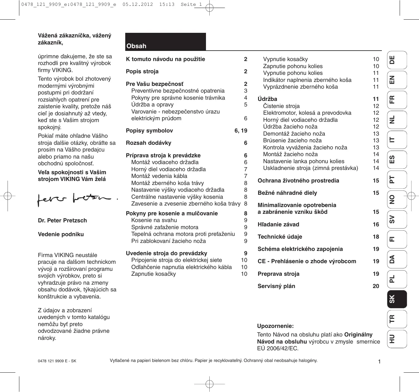Upozornenie: Tento Návod na obsluhu platí ako Originálny Návod na obsluhu výrobcu v zmysle smernice EÚ 2006/42/EC.