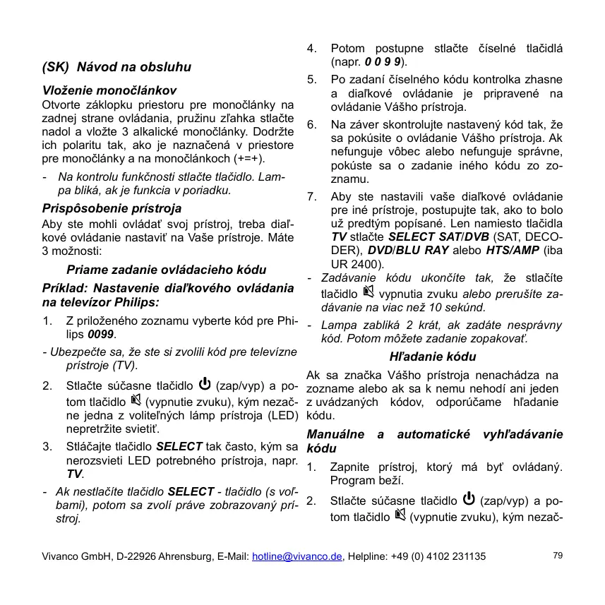 Na záver skontrolujte nastavený kód tak, že sa pokúsite o ovládanie Vášho prístroja. Ak nefunguje vôbec alebo nefunguje správne, pokúste sa o zadanie iného kódu zo zo- Na kontrolu funkčnosti stlačte tlačidlo. Lamznamu. pa bliká, ak je funkcia v poriadku. 7. Aby ste nastavili vaše diaľkové ovládanie Prispôsobenie prístroja pre iné prístroje, postupujte tak, ako to bolo už predtým popísané. Len namiesto tlačidla Aby ste mohli ovládať svoj prístroj, treba diaľTV stlačte SELECT SAT/DVB (SAT, DECOkové ovládanie nastaviť na Vaše prístroje. Máte DER), DVD/BLU RAY alebo HTS/AMP (iba 3 možnosti: UR 2400). Priame zadanie ovládacieho kódu - Zadávanie kódu ukončíte tak, že stlačíte Príklad: Nastavenie diaľkového ovládania tlačidlo vypnutia zvuku alebo prerušíte zana televízor Philips: dávanie na viac než 10 sekúnd. 1. Z priloženého zoznamu vyberte kód pre Phi- - Lampa zabliká 2 krát, ak zadáte nesprávny lips 0099. kód. Potom môžete zadanie zopakovať. - Ubezpečte sa, že ste si zvolili kód pre televízne Hľadanie kódu prístroje (TV). Ak sa značka Vášho prístroja nenachádza na 2. Stlačte súčasne tlačidlo (zap/vyp) a po- zozname alebo ak sa k nemu nehodí ani jeden tom tlačidlo (vypnutie zvuku), kým nezač- z uvádzaných kódov, odporúčame hľadanie ne jedna z voliteľných lámp prístroja (LED) kódu. nepretržite svietiť. Manuálne a automatické vyhľadávanie 3. Stláčajte tlačidlo SELECT tak často, kým sa kódu nerozsvieti LED potrebného prístroja, napr. 1. Zapnite prístroj, ktorý má byť ovládaný. TV. Program beží. - Ak nestlačíte tlačidlo SELECT - tlačidlo (s voľ2. Stlačte súčasne tlačidlo (zap/vyp) a pobami), potom sa zvolí práve zobrazovaný prítom tlačidlo (vypnutie zvuku), kým nezačstroj. Vivanco GmbH, D-22926 Ahrensburg, E-Mail: hotline@vivanco.de, Helpline: +49 (0) 4102 231135
