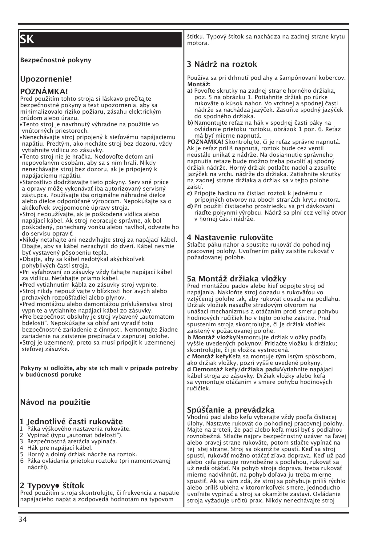 1 Levier de réglage hauteur manche 2 Interrupteur marche/arrêt (type de sécurité) 3 Disp. de blocage de sécurité interrupteur marche/arrêt 4 Crochet pour cordon d.alimentation 5 Support supérieur et inférieur reservoir solution 6 Levier dosage solution (une fois le réservoir installé)