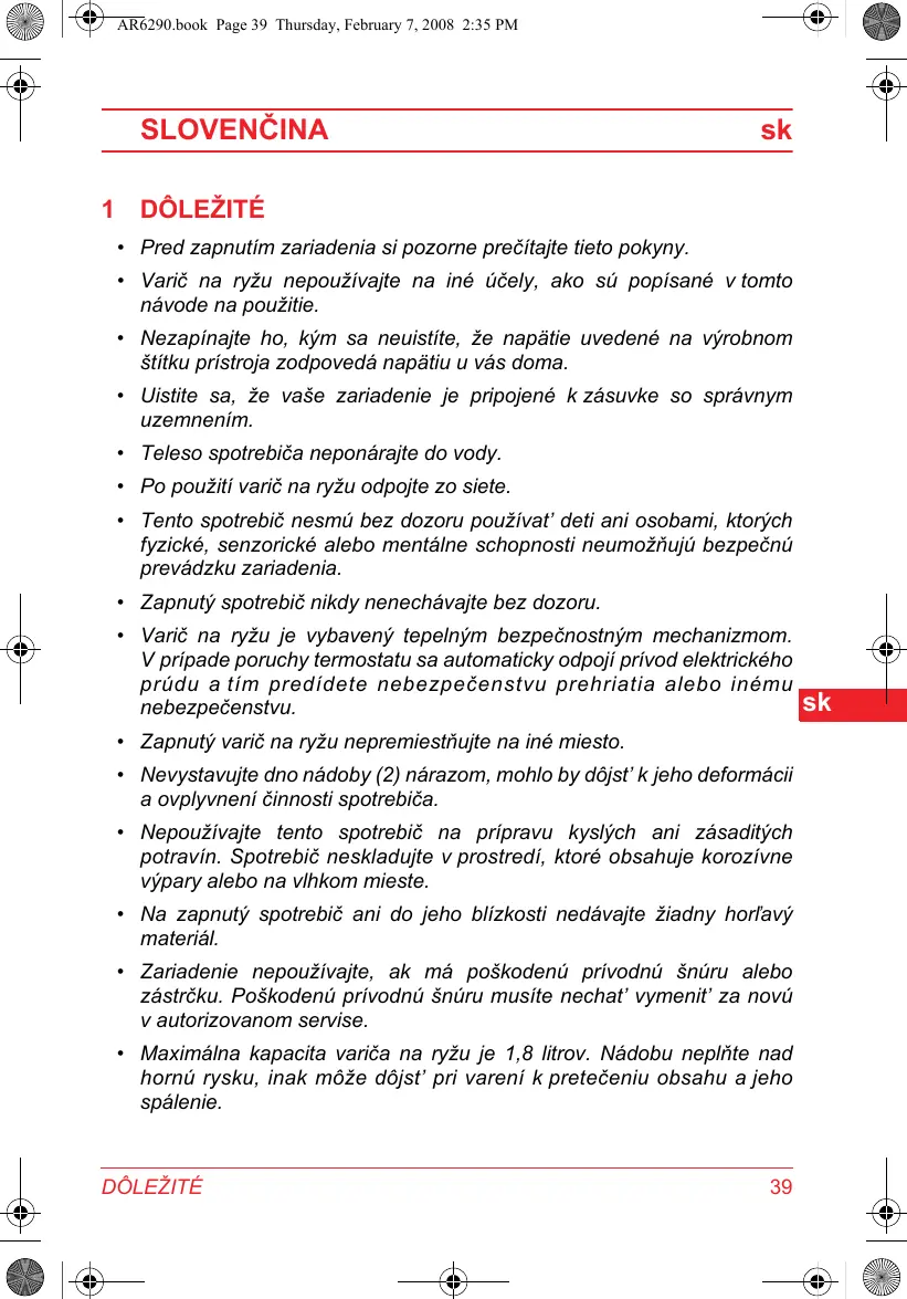 Nádobu aj teleso spotrebica musite vždy umyt', aby ste zabraneli prilepeniu zvyškov potravín, zrniek ryže alebo akýchkol'vek necistôt. Medzi nádobou (2) a varnou doskou (3) nesmú byt' ziadne cudzie predmety, inak moze dojst' k ovplyvneniu funkcie prístroja, pripadne k spáleniu sučastí prístroja.