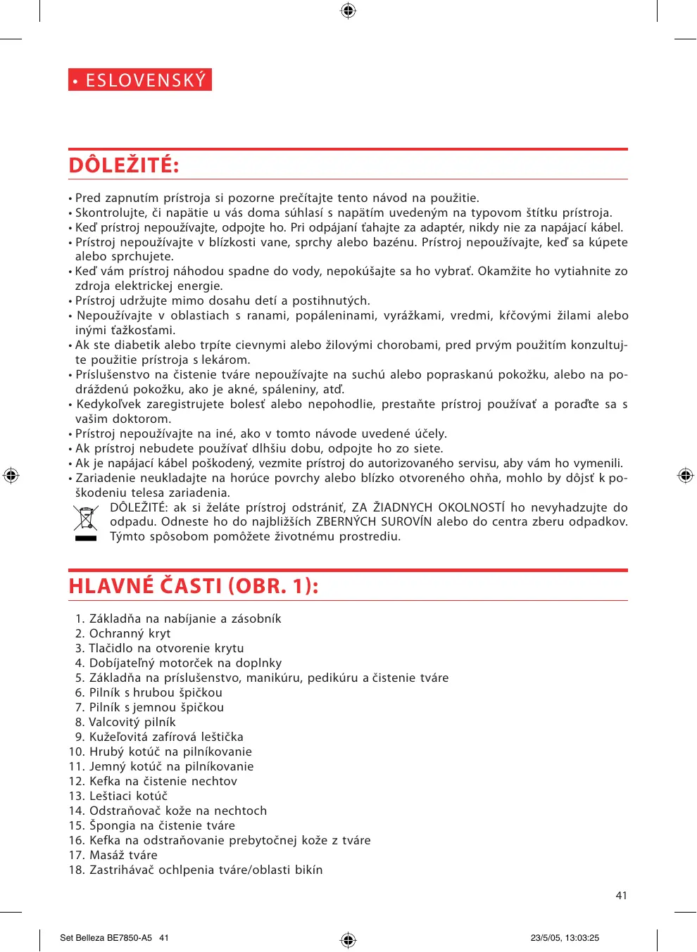 - Z bezpečnostněch dovodov bude dobíjatevný motorček na príslušenstvo (4) pracovat, iba ak je základ-na (5), zastrihávač tváre a oblasti bikin (18) alebo klieste na mihalnice (22), pripevná správyne.
