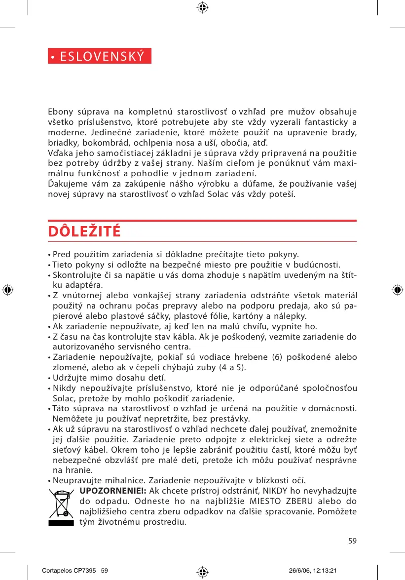 - Supravu na starostlivost o vzhlad āstco kontrlujte, ā nevykazuje akúkol'vek známku opotrebenia alebo poskodenia. Ak sa objaví ktorýkol'vek z tychto znakov, alebo bol vyrobok použitý nesprávné, zoberte ho do autorizovaného servisného centra.
