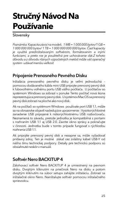 Stručný Návod Na Používanie Slovensky Poznámka: Kapacita závisí na modeli. 1 MB = 1 000 000 bytov/1 GB = 1 000 000 000 bytov/ 1 TB = 1 000 000 000 000 bytov. Časť kapacity je využitá predinštalovaným softvérom, formátovaním a inými funkciami, a preto nie je použiteľná pre uchovávanie dát.Z tohoto dôvodu a z dôvodu rôznych výpočetných metód môže váš operačný systém udávať menšiu veľkosť.