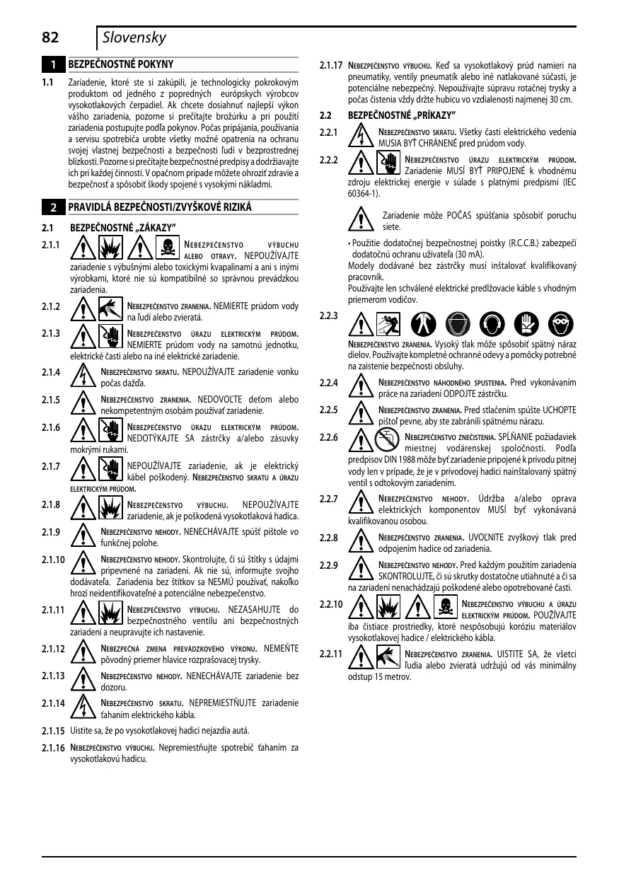 2.2.3 Nebezpečenstvo zranenia. Vysoký tlak môže spôsobiť spätný náraz dielov. Používajte kompletné ochranné odevy a pomôcky potrebné na zaistenie bezpečnosti obsluhy.