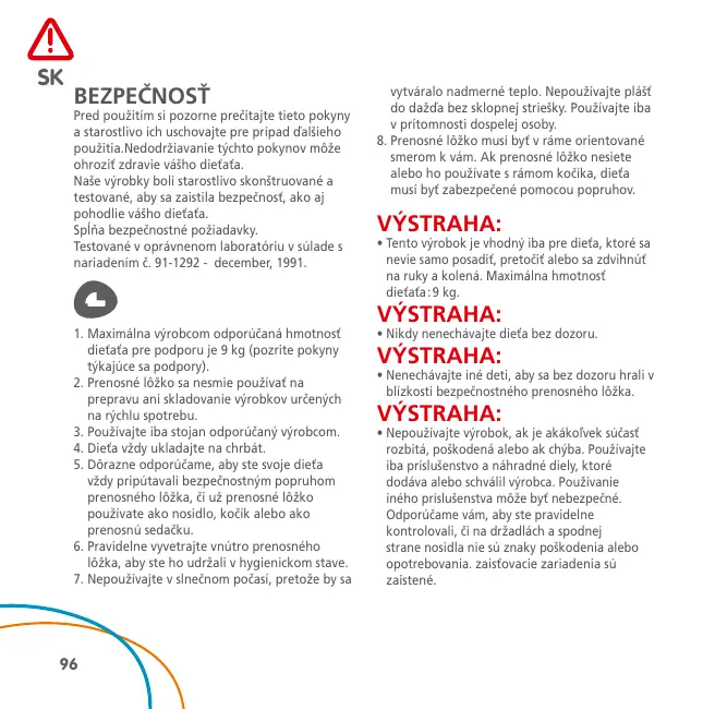 BEZPEČNOSŤ Pred použitím si pozorne prečítajte tieto pokyny a starostlivo ich uschovajte pre prípad ďalšieho použitia.Nedodržiavanie týchto pokynov môže ohroziť zdravie vášho dieťaťa. Naše výrobky boli starostlivo skonštruované a testované, aby sa zaistila bezpečnosť, ako aj pohodlie vášho dieťaťa. Spĺňa bezpečnostné požiadavky. Testované v oprávnenom laboratóriu v súlade s nariadením č. 91-1292 - december, 1991.