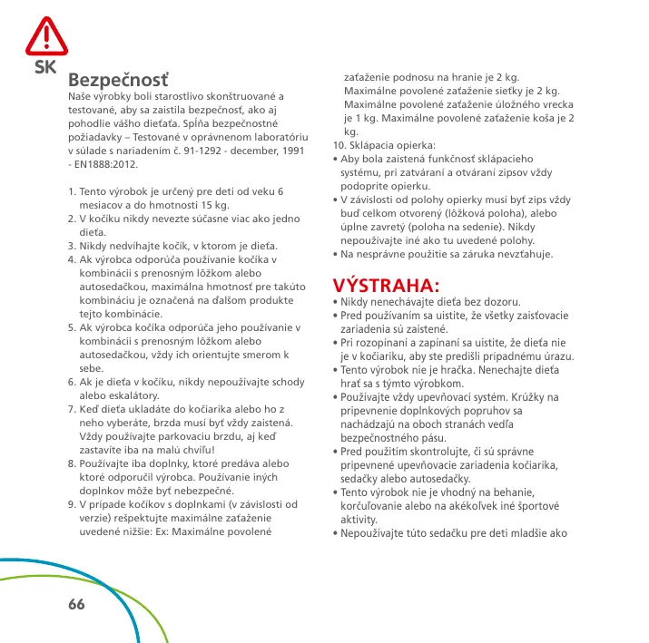 1. Tento výrobok je určený pre deti od veku 6 mesiacov a do hmotnosti 15 kg. 2. V kočíku nikdy nevezte súčasne viac ako jedno dieťa. 3. Nikdy nedvíhajte kočík, v ktorom je dieťa. 4. Ak výrobca odporúča používanie kočíka v kombinácii s prenosným lôžkom alebo autosedačkou, maximálna hmotnosť pre takúto kombináciu je označená na ďalšom produkte tejto kombinácie. 5. Ak výrobca kočíka odporúča jeho používanie v kombinácii s prenosným lôžkom alebo autosedačkou, vždy ich orientujte smerom k sebe. 6. Ak je dieťa v kočíku, nikdy nepoužívajte schody alebo eskalátory. 7. Keď dieťa ukladáte do kočiarika alebo ho z neho vyberáte, brzda musí byť vždy zaistená. Vždy používajte parkovaciu brzdu, aj keď zastavíte iba na malú chvíľu! 8. Používajte iba doplnky, ktoré predáva alebo ktoré odporučil výrobca. Používanie iných doplnkov môže byť nebezpečné. 9. V prípade kočíkov s doplnkami (v závislosti od verzie) rešpektujte maximálne zaťaženie uvedené nižšie: Ex: Maximálne povolené