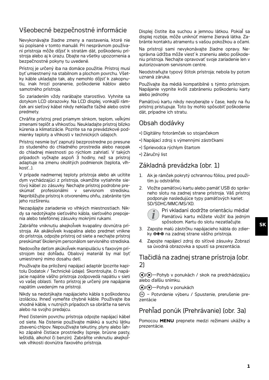 Nevykonávajte ziadne zmeny a nastavenia, ktoré nisú popisané v totom manuāl. Pri nesprávnom použivaní prístoja moze dōjst' k stramát, poskodeniu prístroja alebo aj k urazu. Dbajté na vsetky upozernenia abbepečnostné pokyny tu uvedene.