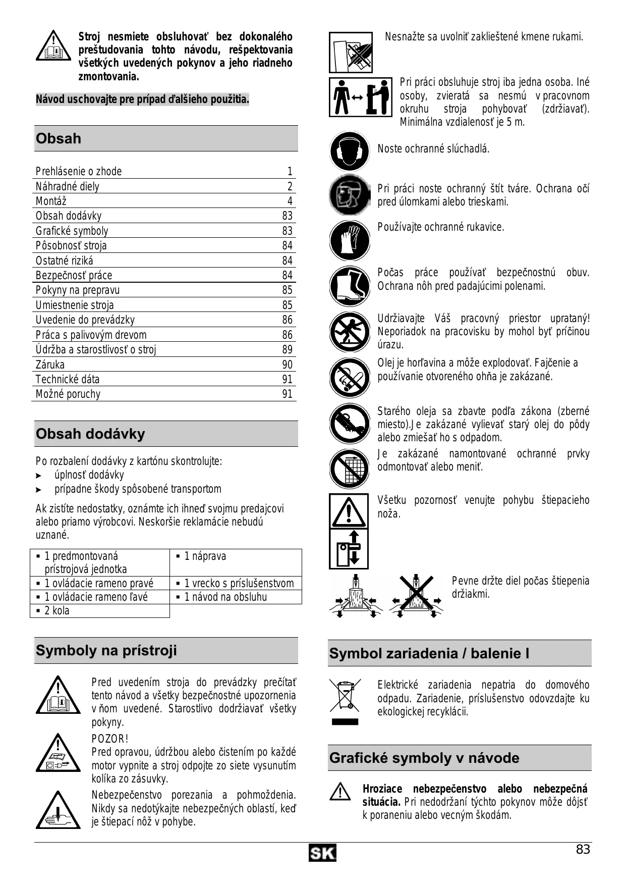 Stroj nesmiete obsluhovať bez dokonalého preštudovania tohto návodu, rešpektovania všetkých uvedených pokynov a jeho riadneho zmontovania. Návod uschovajte pre prípad ďalšieho použitia. Obsah Nesnažte sa uvolniť zaklieštené kmene rukami. Pri práci obsluhuje stroj iba jedna osoba. Iné osoby, zvieratá sa nesmú v pracovnom okruhu stroja pohybovať (zdržiavať). Minimálna vzdialenosť je 5 m. Noste ochranné slúchadlá. Prehlásenie o zhode Náhradné diely Montáž Obsah dodávky Grafické symboly Pôsobnosť stroja Ostatné riziká Bezpečnosť práce Pokyny na prepravu Umiestnenie stroja Uvedenie do prevádzky Práca s palivovým drevom Údržba a starostlivosť o stroj Záruka Technické dáta Možné poruchy