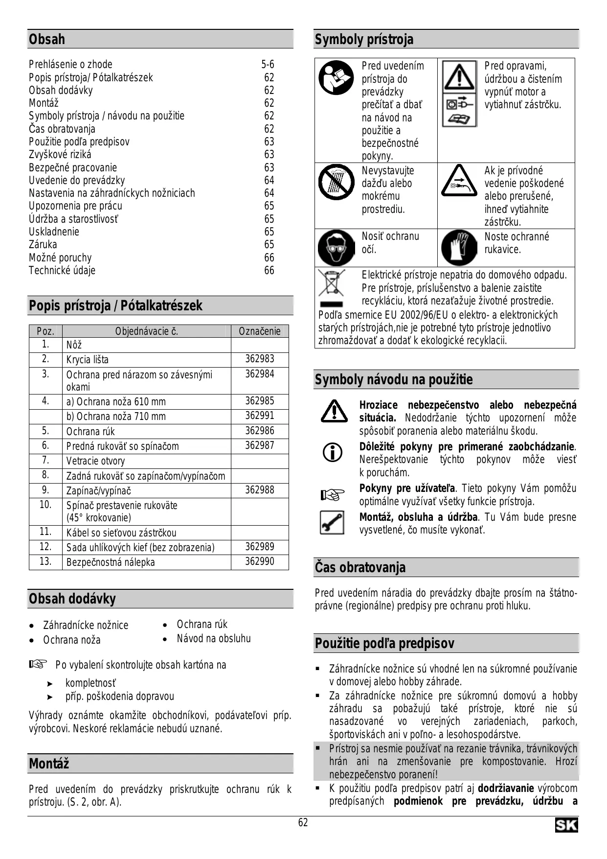 Mise en service 19 les conseils de la bougie avant Consignes de travail 20 sécurité avant ||[f@j5-| toute opération Maintenance et entretien 20 là mise en | d'entretien, de Stockage 20 marche eten remise en état ou Garantie 21 tenir compte de nettoyage. Perturbations susceptibles de se présenter 21 pendant le Caractéristiques techniques 21 fonctionement. Ne pas ex- Retirer immédiate- = = poser la ment la fiche du Description de l'équipement / © machine à la secteur lorsque le Pièces de rechange pluie ou à câble de connexion l'humidité. est endommagé. Pos. Référence de commande Désignation Porter des Porter des gants de 1. | Couteau Q lunettes de protection. 2. | Barre de recouvrement 362983 protection. 3. | Protection anti-choc avec pattes de 362984 Ne jamais jeter un appareil électrique aux ordures suspension ménagères. Les appareils, les accessoires et les 4. |) Protection des couteaux 610 mm 362985 mms Smelages doivent être recyclés de façon non b) Protection des couteaux 710 mm 362991 A polluante. ; A ; = Conformément à la directive européenne 2002/96/CE relative 5: _ | Protection des mains 362986 aux déchets d'équipements électriques et électroniques, les 6. | Poignée avant avec bouton 362987 appareils électriques ne pouvant plus être utilisés doivent être d'interruption collectés séparément et recyclés d'une manière respectueuse 7. | Fentes d'aération de l'environnement. 8 | Poignée arrière avec interrupteur 9] Interrupteur 362988 Symbolique de ces instructions de service 10. | Cliquet pour le réglage de l'angle de la poignée arrière À Danger imminent ou situation dangereuse. 11. | Câble avec fiche de secteur L'inobservation de ces indications génère des 12. | jeu de charbons (sans figure] 362989 risques de blessures ou d'endommagements 13. | Etiquette de sécurité 362990 matériels. Indications importantes pour un emploi conforme à l’usage prévu. L'inobservation de ces Fourniture indications peut provoquer des défauts de fonctionnement. e Taille-haie + Protection des mains