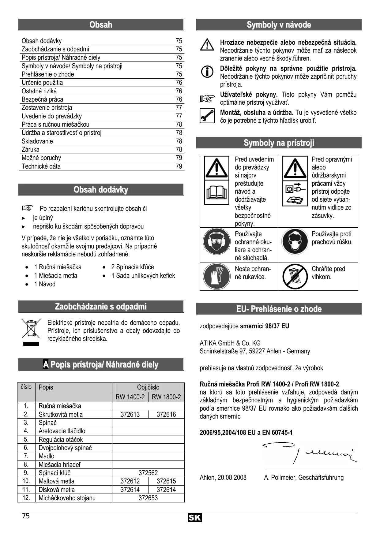 zodpovedajúce smernici 98/37 EU ATIKA GmbH & Co. KG Schinkelstraße 97, 59227 Ahlen - Germany prehlasuje na vlastnú zodpovednosť, že výrobok Ručná miešačka Profi RW 1400-2 / Profi RW 1800-2 na ktorú sa toto prehlásenie vzťahuje, zodpovedá daným základným bezpečnostným a hygienickým požiadavkám podľa smernice 98/37 EU rovnako ako požiadavkám ďalších daných smerníc 2006/95,2004/108 EU a EN 60745-1