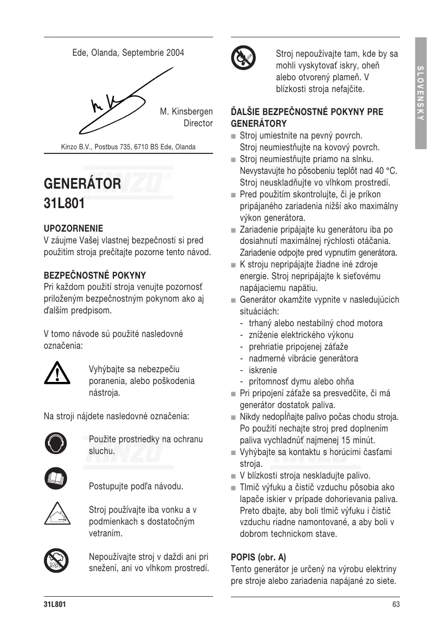 SLOVENSKY M. Kinsbergen Director Stroj nepoužívajte tam, kde by sa mohli vyskytovao iskry, oheň alebo otvorený plameň. V blízkosti stroja nefajčite. SLOVENSKY