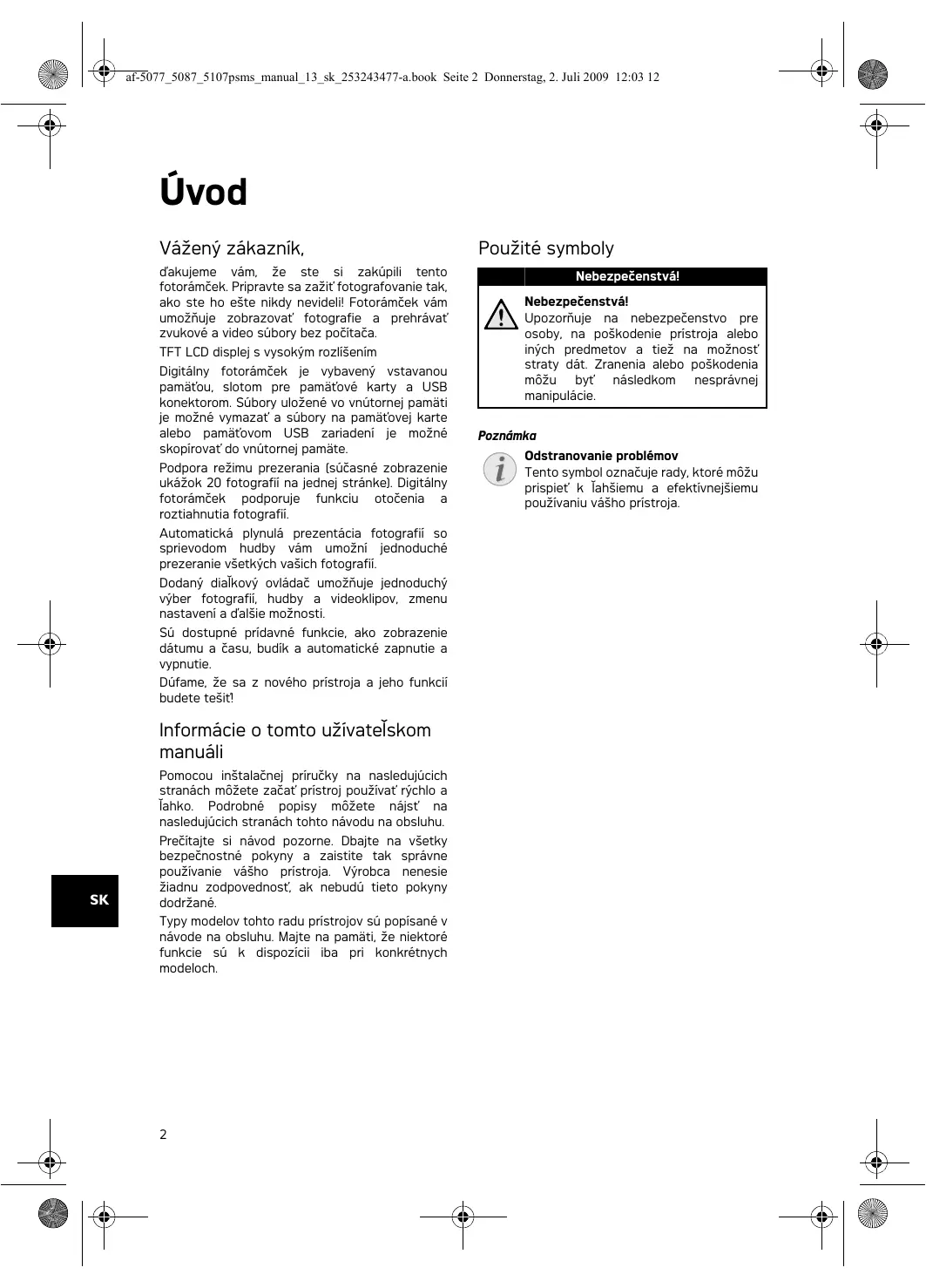 af-5077_5087_5107psms_manual_13_sk_253243477-a.book Seite 2 Donnerstag, 2. Juli 2009 12:03 12 Úvod Vážený zákazník, ďakujeme vám, že ste si zakúpili tento fotorámček. Pripravte sa zažiť fotografovanie tak, ako ste ho ešte nikdy nevideli! Fotorámček vám umožňuje zobrazovať fotografie a prehrávať zvukové a video súbory bez počítača. Použité symboly Nebezpečenstvá Nebezpečenstvá! Nebezpečenstvá! Upozorňuje na nebezpečenstvo pre osoby, na poškodenie prístroja alebo iných predmetov a tiež na možnosť straty dát. Zranenia alebo poškodenia môžu byť následkom nesprávnej manipulácie. TFT LCD displej s vysokým rozlíšením Pamäť Digitálny fotorámček je vybavený vstavanou pamäťou, slotom pre pamäťové karty a USB konektorom. Súbory uložené vo vnútornej pamäti je možné vymazať a súbory na pamäťovej karte alebo pamäťovom USB zariadení je možné skopírovať do vnútornej pamäte. Podpora režimu prezerania (súčasné zobrazenie ukážok 20 fotografií na jednej stránke). Digitálny fotorámček podporuje funkciu otočenia a roztiahnutia fotografií. Automatická plynulá prezentácia fotografií so sprievodom hudby vám umožní jednoduché prezeranie všetkých vašich fotografií. Dodaný diaľkový ovládač umožňuje jednoduchý výber fotografií, hudby a videoklipov, zmenu nastavení a ďalšie možnosti. Sú dostupné prídavné funkcie, ako zobrazenie dátumu a času, budík a automatické zapnutie a vypnutie. Dúfame, že sa z nového prístroja a jeho funkcií budete tešiť! Informácie o tomto užívateľskom manuáli Pomocou inštalačnej príručky na nasledujúcich stranách môžete začať prístroj používať rýchlo a ľahko. Podrobné popisy môžete nájsť na nasledujúcich stranách tohto návodu na obsluhu.