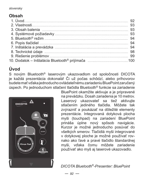 | BluePoint nefunguje. | • V zariadeni nie je batériya, batériya je vybitá alebo nesprávné vložné. • Párovanie neblo vúspežné. • PC nedokāze rozpoznám zariadenie. • Nesprávná inštalácia applíkácie BLUEPOINT. | • Skontrolujte stav batérié. • Vo vašom PC/notesbooku aktiviţje bezdržćtovu Bluetooth® funksiu. Ak vaš PC/notesbook nemá zakompanovaný bezdržćtovu Bluetooth® techno-lógiu, pripoje k nemu externý bezdržćtovu Bluetooth® prijimač. • Vyhřadánvanie a párovanie zariadenia vykonajte podla postupu v ľasti „inštalácia a prevadžka". • Odinštalovanie a preinštalovanie vykonajte podla postupu v ľasti „inštalácia a prevadžka". |