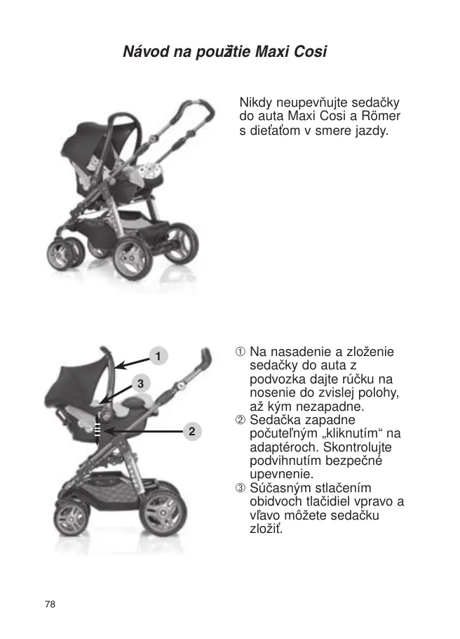 Návod na použitie Maxi Cosi Nikdy neupevňujte sedačky do auta Maxi Cosi a Römer s dieťaťom v smere jazdy.