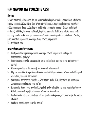 > Pred použitím si prosím pozorne prečítajte návod na použitie a dbajte na bezpečnostné pokyny! > Nepoužívajte zásuvku s časovačom ak je poškodená, obráťte sa na autorizovaný servis! > Zásuvku používajte iba v suchých uzavretých priestoroch! > Aby ste predišli riziku požiaru alebo úrazu elektrickým prúdom, zásuvku chráňte pred vlhkosťou, vodou a horúčavou! > Maximálna záťaž tejto zásuvky je 2500 Watt alebo 10A. Uistite sa, že pripájané zariadenia neprekračujú túto záťaž! > Zariadenia, ktoré robia mechanický pohyb alebo vibrujú a nemajú vlastný prívodový kábel, sa nesmú zapojiť priamo do zásuvky s časovačom! > Pred čistením odpojte zariadenie od zdroja elektrickej energie a používajte iba suchú utierku! > Nikdy sa nepokúšajte zásuvku otvoriť! > Udržiavajte mimo dosahu detí! > Nedodržiavanie bezpečnostných pokynov môže viesť k poškodeniu časovacej zásuvky alebo k úrazu osôb! > Používajte zásuvku s časovačom iba k účelom, na ktoré je určená!