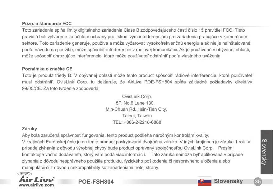 POE-FSH804 Pozn. o štandarde FCC Toto zariadenie spĺňa limity digitálneho zariadenia Class B zodpovedajúceho časti číslo 15 pravidiel FCC. Tieto pravidlá boli vytvorené za účelom ochrany proti škodlivým interferenciám pre zariadenia pracujúce v komerčnom sektore. Toto zariadenie generuje, používa a môže vyžarovať vysokofrekvenčnú energiu a ak nie je nainštalované podľa návodu na použitie, môže spôsobiť interferencie v rádiovej komunikácii. Ak je používané v obývanej oblasti, môže spôsobiť ohrozujúce interferencie, ktoré môže používateľ odstrániť podľa vlastného uváženia. Poznámka o značke CE Toto je produkt triedy B. V obývanej oblasti môže tento product spôsobiť rádiové interferencie, ktoré používateľ musí odstrániť. OvisLink Corp. tu deklaruje, že AirLive POE-FSH804 spĺňa základné požiadavky direktívy 99/05/CE. Za toto tvrdenie zodpovedá: OvisLink Corp. 5F, No.6 Lane 130, Min-Chuan Rd, Hsin-Tien City, Taipei, Taiwan