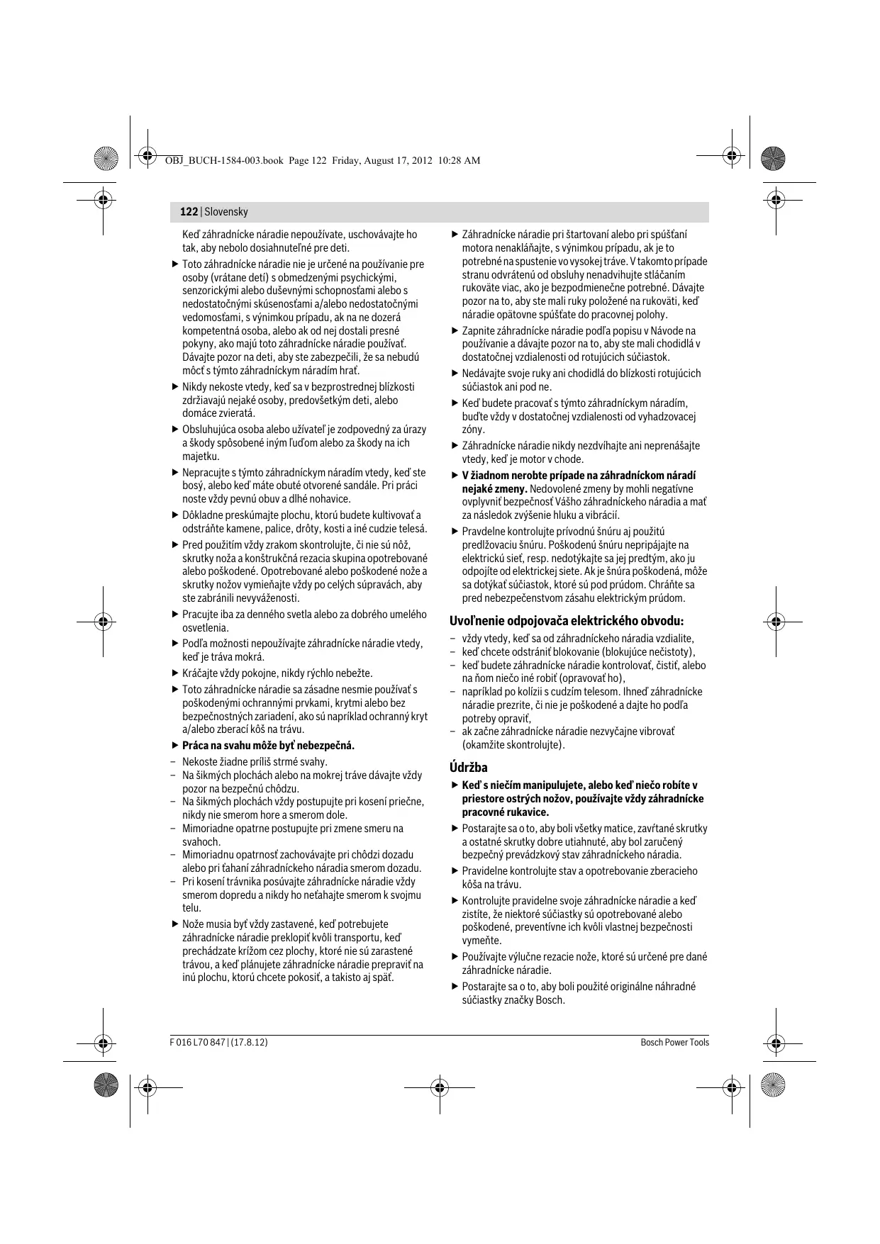 4,0 4,0 0 – 45 0 – 45 1,0 1,0 /II /II **s nabíjačkou AL 3620 CV Professional Všimnite si láskavo vecné číslo na typovom štítku svojho záhradníckeho náradia. Obchodné názvy jednotlivých kusov záhradníckeho náradia sa môžu odlišovať. Informácia o hlučnosti/vibráciách Vyhlásenie o konformite Namerané hodnoty pre hlučnosť zisťované podľa 2000/14/ES (výška 1,60 m, vzdialenosť 1 m). Vyhodnotená hodnota hladiny hluku A tohto náradia je typicky: Hladina akustického tlaku 74 dB(A); hladina akustického výkonu 86 dB(A). Nespoľahlivosť merania K =0,42 dB. Celkové hodnoty vibrácií (súčet vektorov troch smerov) zisťované podľa normy EN 60335: Hodnota emisie vibrácií ah <2,5 m/s2, Nespoľahlivosť merania K=1,5 m/s2. Na vlastnú zodpovednosť vyhlasujeme, že tento výrobok, popísaný nižšie v časti „Technické údaje“, sa zhoduje s nasledujúcimi normami alebo normatívnymi dokumentmi: EN 60335, EN 50338 (akumulátorové náradie) a EN 60335 (nabíjačka akumulátorov) podľa ustanovení smerníc 2011/65/EÚ, 2004/108/ES, 2006/42/ES, 2000/14/ES. 2000/14/ES: Nameraná hladina akustického tlaku 87 dB(A). Spôsob hodnotenia konformity podľa prílohy VI. Kategória produktu: 32 Poverené pracovisko: SRL, Sudbury, England, Nr. 1088 F 016 L70 847 | (17.8.12) Bosch Power Tools OBJ_BUCH-1584-003.book Page 125 Friday, August 17, 2012 10:28 AM Slovensky | 125 Súbor technickej dokumentácie (2000/14/ES, 2011/65/EÚ) sa nachádza u: Bosch Lawn and Garden Ltd., PT-LG/ENS4, Stowmarket, Suffolk IP14 1EY, England Dr. Egbert Schneider Helmut Heinzelmann Senior Vice President Head of Product Engineering Certification Robert Bosch GmbH, Power Tools Division D-70745 Leinfelden-Echterdingen