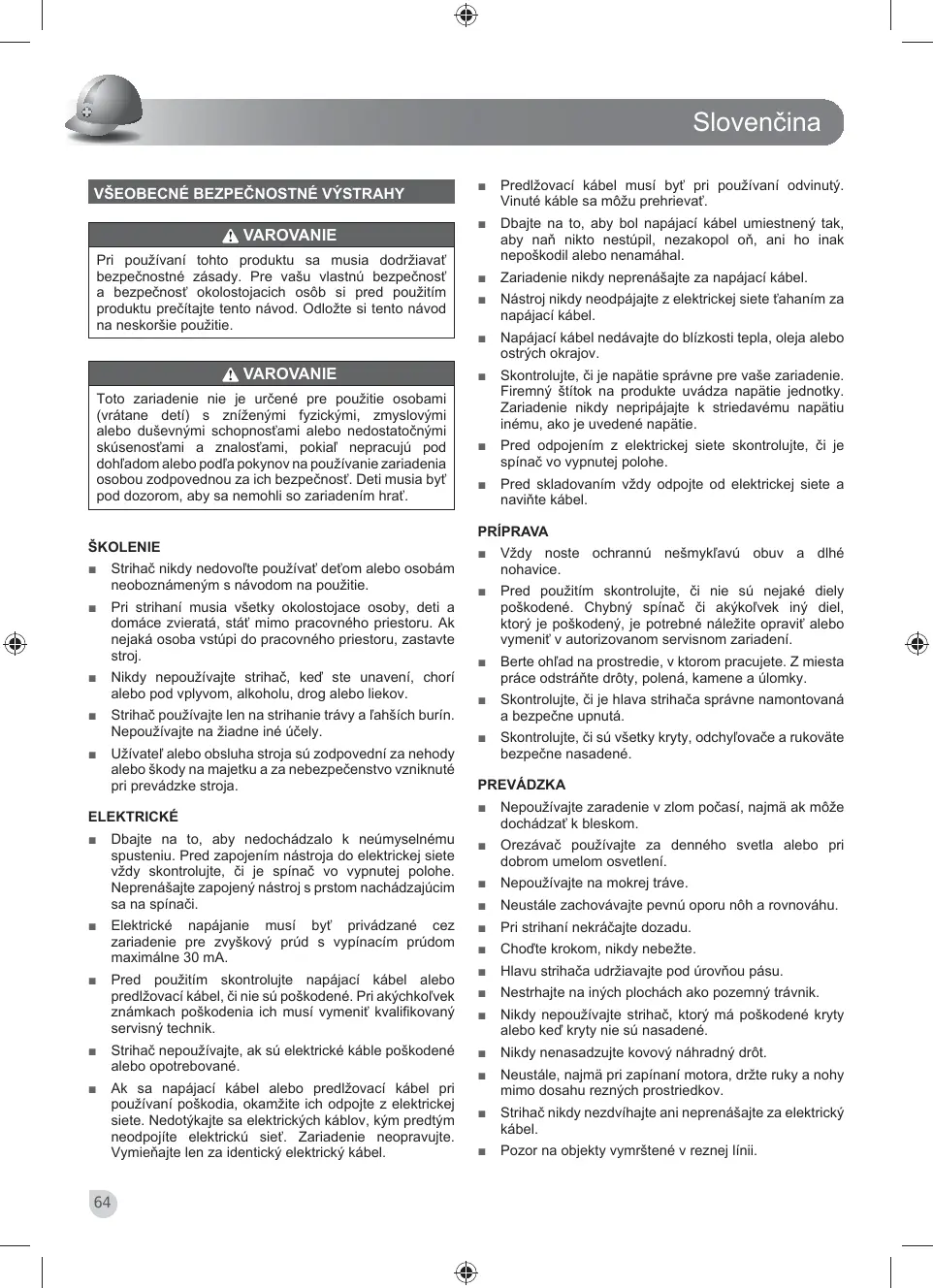 ZNAČKY Ak sa kábel poškodí alebo pretrhne, bezprostredne pred vykonaním údržby odpojte zástrčku z elektrickej siete. Pozor na vymrštené alebo odletujúce objekty. Okolostojacich udržiavajte v bezpečnej vzdialenosti od zariadenia. Dvojitá izolácia