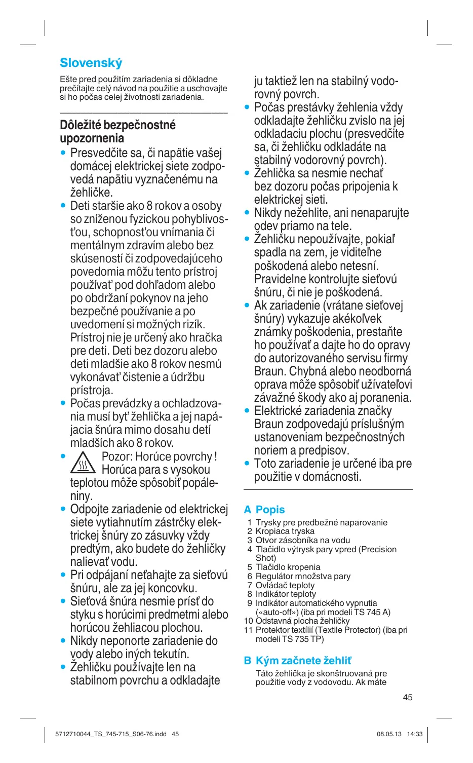 extrémne tvrdú vodu, odporúãame pouÏívaÈ zmes 50% vody z vodovodu a 50% destilovanej vody. NaplÀte zásobník na vodu aÏ po znaãku «max». Nikdy nepouÏívajte iba destilovanú vodu. Nepridávajte Ïiadne aditíva napr. ‰krob. NepouÏívajte skondenzovanú vodu zo su‰iãky na bielizeÀ. Predt˘m, ako budete nalievaÈ vodu, vypnite regulátor pary («0» = para vypnutá). DrÏte Ïehliãku mierne naklonenú, tak ako je to znázornené na obr. (B), a naplÀte zásobník na vodu aÏ po znaãku «max». Postavte Ïehliãku zvislo na jej odstavnú plochu a zapojte sieÈovú ‰núru do elektrickej siete. Zvoºte teplotu podºa údajov na odstavnej ploche Ïehliãky alebo na etikete na obleãení. Indikátor (8) zhasne, akonáhle je dosiahnutá zvolená teplota (po cca 1 1/2 min.). C Îehlenie Variabilné mnoÏstvo pary Otáãaním regulátora pary (6) môÏete zvoliÈ mnoÏstvo pary v rozsahu «0» aÏ «6». Pre žehlenie s parou sa musí nastaviť regulátor teploty (7) minimálne na pozíciu teploty 2 (••). Pre beÏné Ïehlenie odporúãame nastavenie pary na stredn˘ stupeÀ. Iba v prípade Ïehlenia ºanov˘ch látok, silnej bavlny alebo podobn˘ch tkanín odporúãame nastavenie pary na maximum. Poznámka: Poãas Ïehlenia neotáãajte regulátor pary za polohu «6». Para Vario plus Pre siln˘ v˘trysk pary stlaãte regulátor pary (6) na max. 30 sekúnd. Ovládač teploty (7) sa musí nastaviť minimálne na pozíciu teploty 3 (•••). Precision Shot Najskôr stlaãte tlaãidlo Precision Shot (4) 3 krát aÏ 4 krát, aby ste túto funkciu aktivovali. Stlaãte tlaãidlo Precision Shot v intervaloch najmenej 5 sekúnd, ãím dôjde k siln˘m ãeln˘m v˘tryskom pary, ktoré pripravia látku na Ïehlenie. Funkciu Precision Shot môÏete aktivovaÈ pri Ïehlení nasucho. Avšak regulátor teploty sa musí nastaviť minimálne na pozíciu teploty 3 (•••). Táto funkcia môÏe byÈ pouÏitá aj pri vertikálnej polohe pre Ïehlenie visiacich ‰iat. Pozor: Z trysiek pre predbeÏné naparovanie vychádza horúca para. Funkcia kropenia Stlaãte tlaãidlo kropenia (5). Îehlenie nasucho Nastavte regulátor pary (6) do polohy «0» (= vypnutie pary). Automatické vypnutie (iba pri modeli TS 745 A) Vypínací mechanizmus vydáva poãas Ïehlenia slab˘ ‰um. To je normálne a neindikuje to poruchu Ïehliãky. âerven˘ indikátor «auto-off» (9) bude blikaÈ, keì je automatické vypnutie aktivované. Automatické vypnutie sa aktivuje keì sa Ïehliãka ponechá … – vo vodorovnej polohe leÏaÈ na Ïehliacej ploche po dobu asi 30 sekúnd alebo – je odloÏená vo zvislej polohe na odstavnej ploche asi 8 minút. Ak si Ïeláte Ïehliãku opäÈ zapnúÈ, staãí iba ak s Àou pohnete. Akonáhle indikátor «auto-off» prestane blikaÈ, je Ïehliãka opäÈ napájaná elektrick˘m prúdom. Automatické vypnutie sa aktivuje pribliÏne 2 minúty po pripojení Ïehliãky do zásuvky elektrickej siete. D Textiln˘ protektor (iba pri model TS 735 TP) Pred prv˘m pouÏitím prídavnej Ïehliacej plochy (Textile Protector) (10) Ïehlite Ïehliãkou pribliÏne 2 minúty bez textilného protektora. Textiln˘ protektor Braun chráni chúlostivé látky pred po‰kodením teplom a umoÏÀuje ÏehliÈ aj najtmav‰ie tkaniny bez nutnosti Ïehlenia cez handriãku.